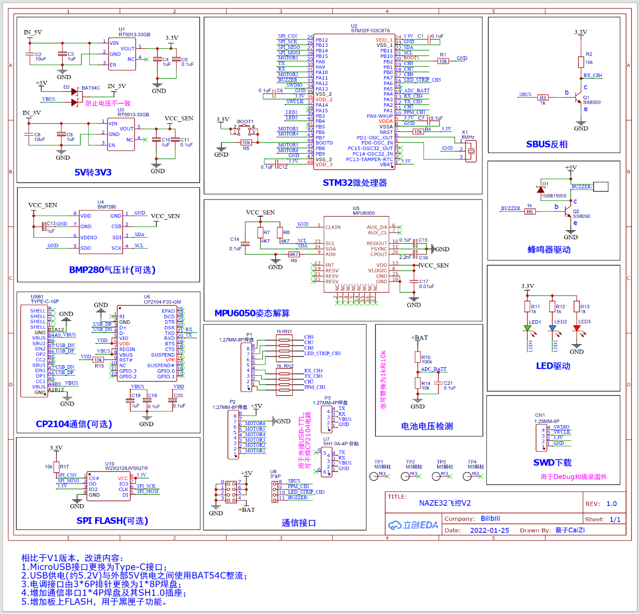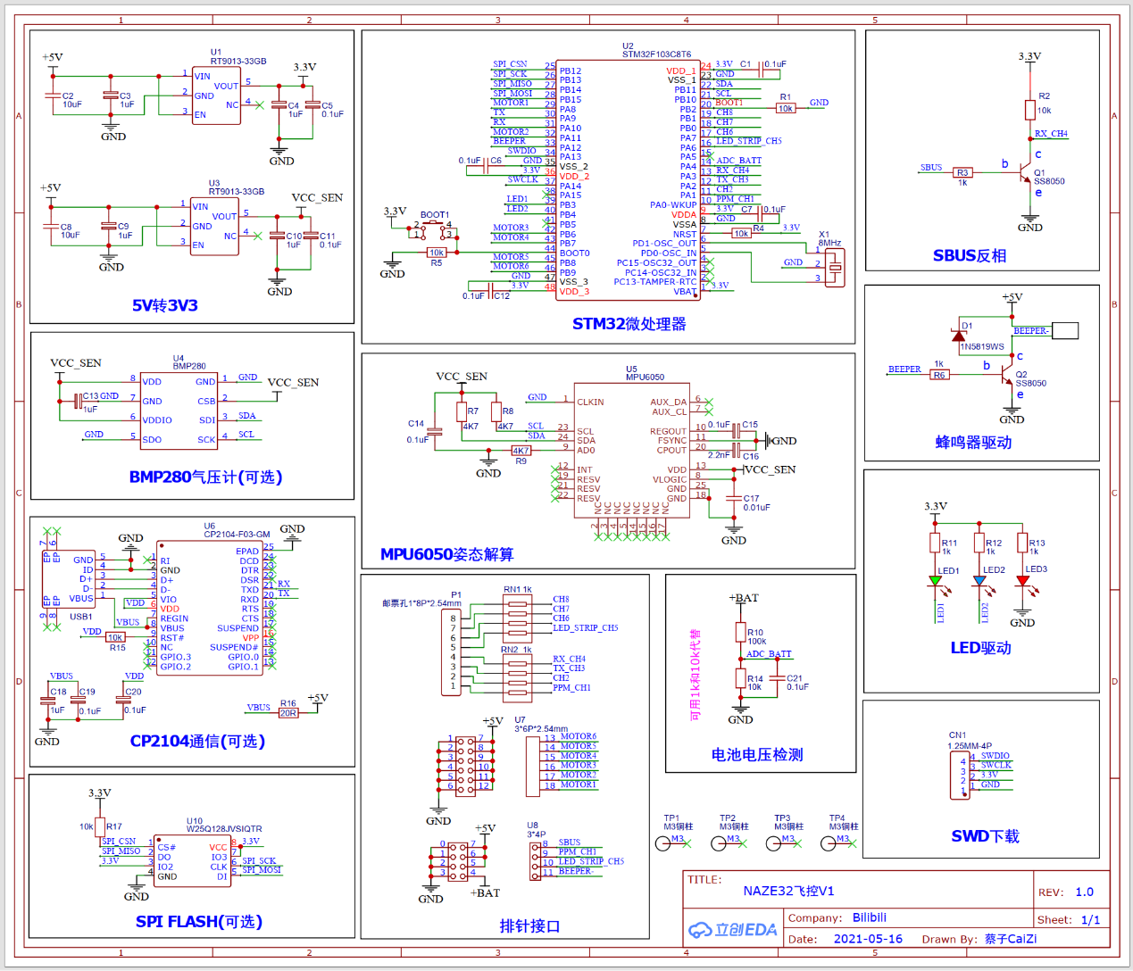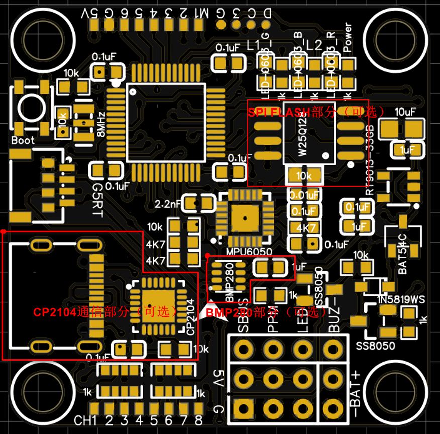 BMP280气压计部分、CP2104串口通信部分、SPI FLASH部分均为可选部分。
