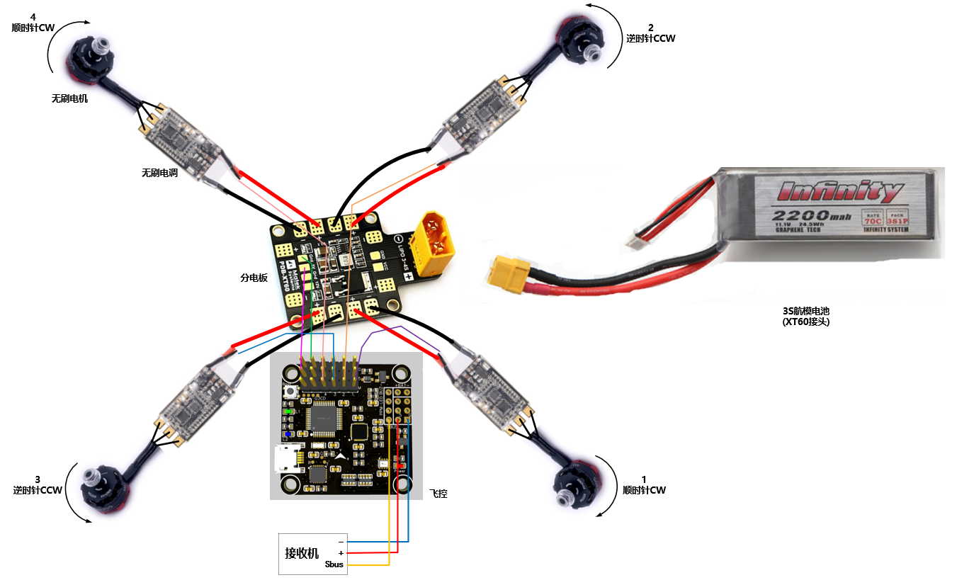 - 接收机有三种接线:SBUS/PPM/PWM,任选其一即可,推荐SBUS;