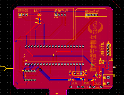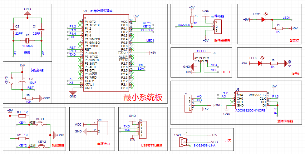该项目使用STC89C52单片机作为核心,通过嘉立创EDA专业版进行设计,通过USB转TTL接口进行下载。使用插接件设计,便于携带和组装,主要使用蜂鸣器模块、MQ3酒精传感器进行检测与报警,并用OLED屏幕辅以信息显示和调试。三个按键分别实现模块功能校准、检测、复位功能,可实现对与气体酒精浓度的检测与警报。