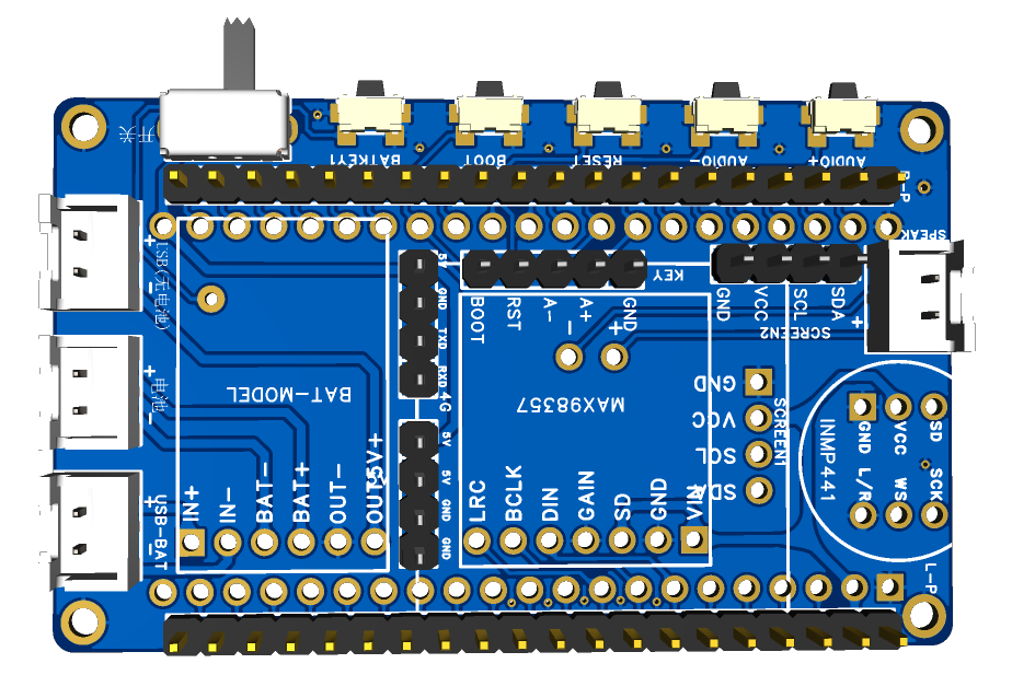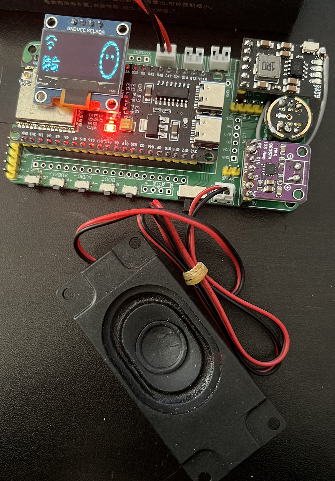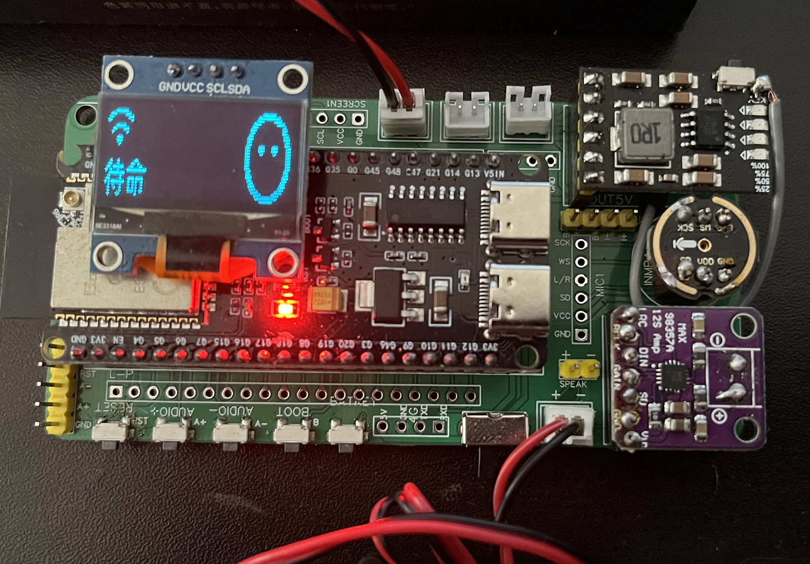 基于果云ESP32-S3开发板或立创ESP32S3开发板、INMP441全向麦克风模块、MAX98357音频放大器模块、 OLED液晶屏模块、2A 5V充放电一体模块制作的AI对话底板