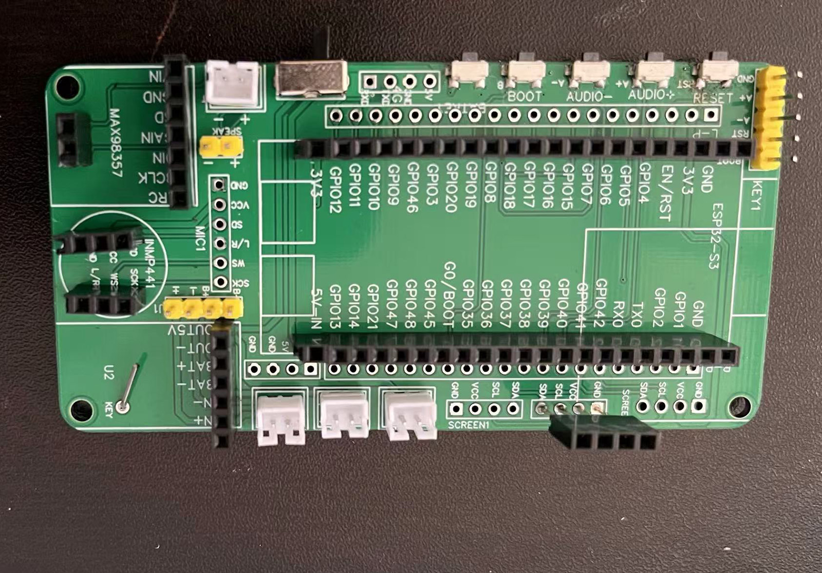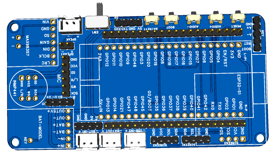 考虑到可能扩展其他的功能,所以把ESP32-S3开发板的接口都引出来了,把显示屏的引脚和麦克风的引脚、按键的引脚也另外引出来,方便后期安装在合适的外壳上,