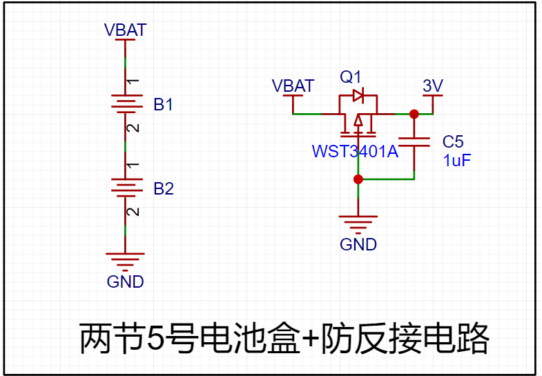 简单两节5号电池供电+防反接电路,不需要任何电压转换就能工作,