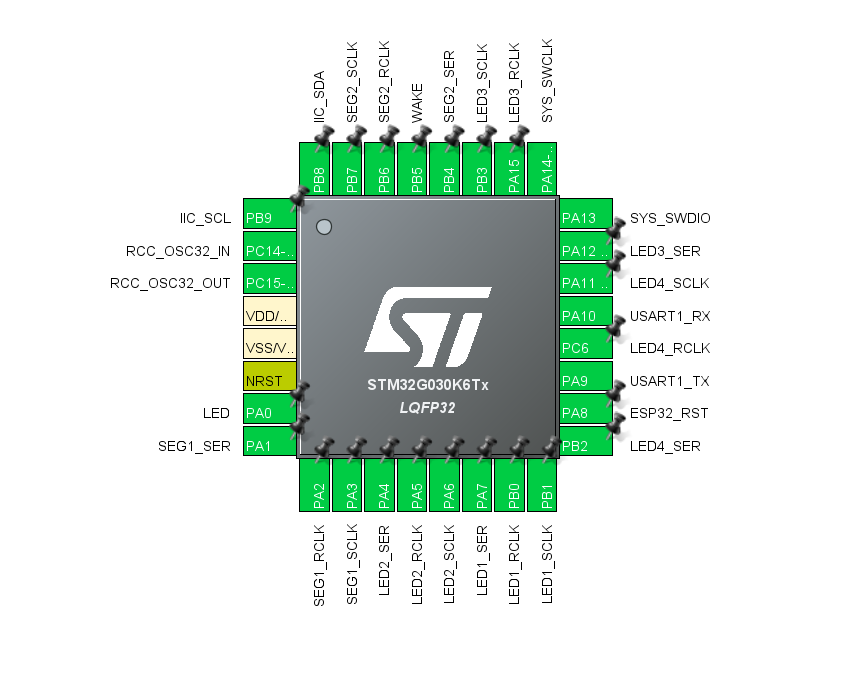 参加第九届立创电赛设计,在官网基础(2*3位数码管显示温湿度)上增加ESP01S联网获取时间,加两个数码管(一共四个)显示时间。提示:优于四个数码管+移位芯片引脚数量很大,所以这次使用的STM32芯片的引脚已经全部使用完了,一个空余的引脚都没有了。