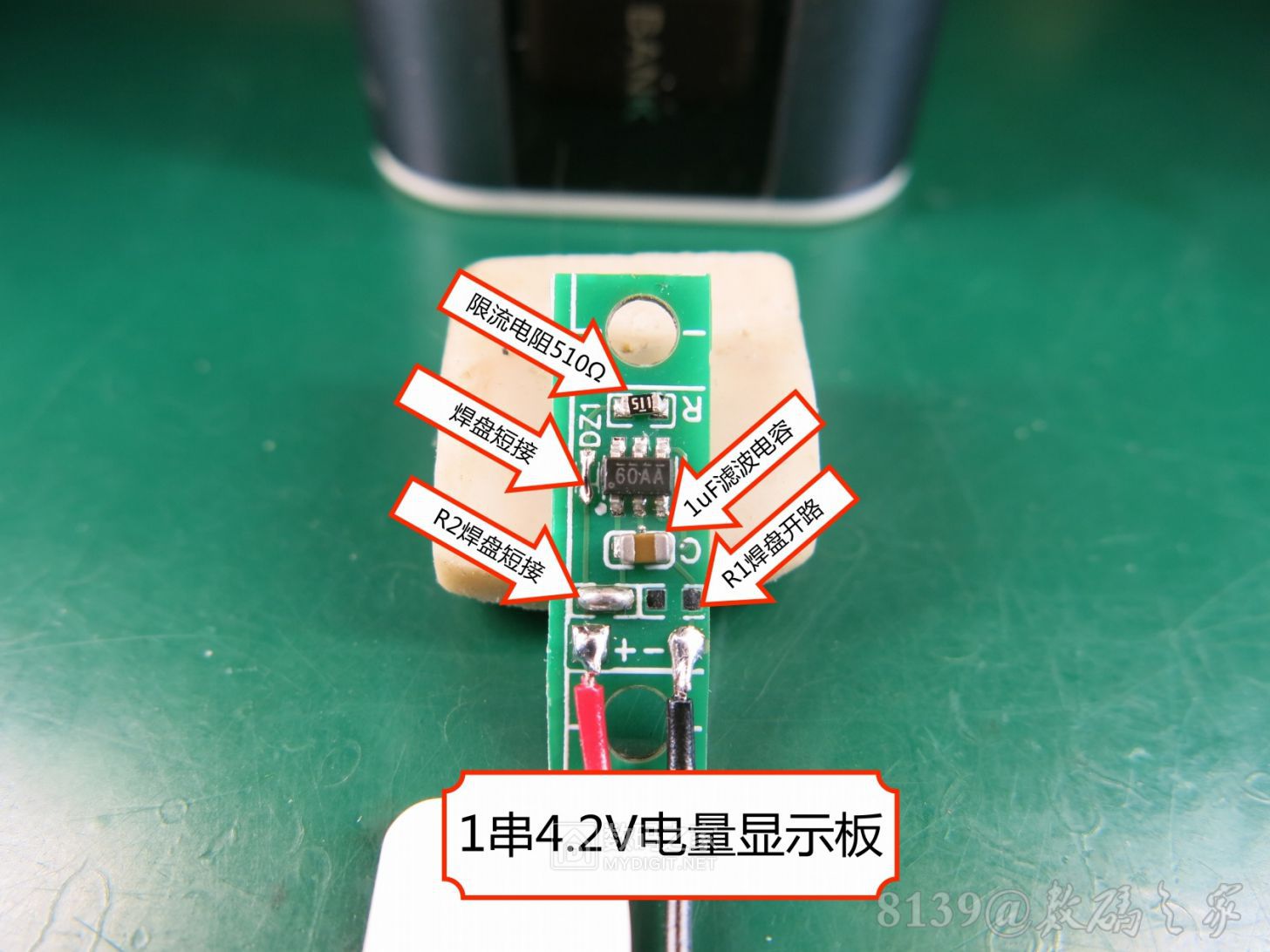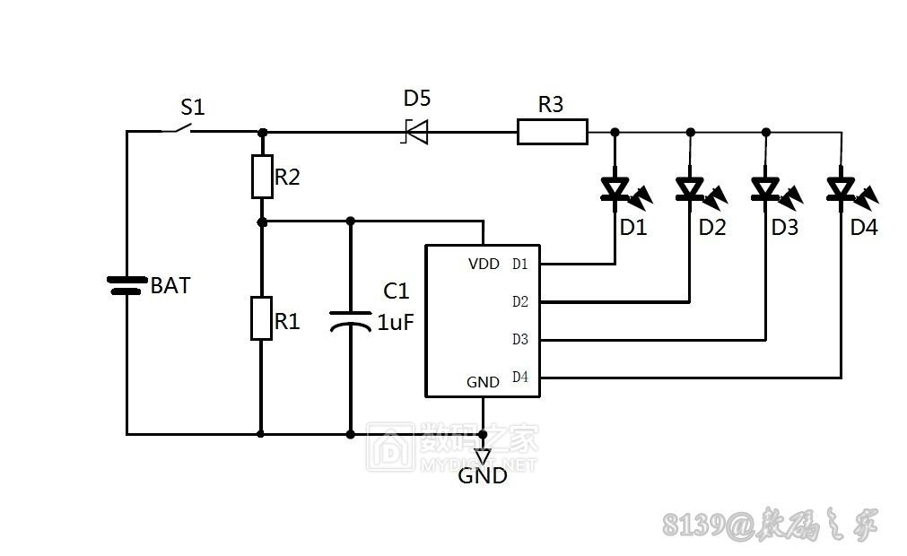 如果想要HM1160支持多串的4.2V锂电池(2S及以上),必须在上面的电路里加上分压电路(因为Vin电压成倍的提高了),然后还要给LED指示部分增加一颗稳压二极管(3S及以上)做反偏稳压,否则HM1160内置驱动LED的mos会软击穿(HM1160的耐压只有6.5V),造成指示灯应该全部熄灭的时候,所有的LED反而会微亮,加上这颗稳压二极管就好了。