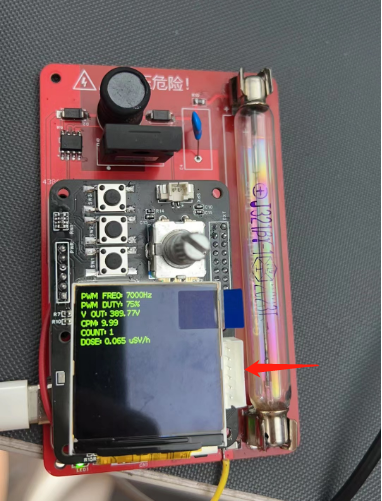通过调整编码器,可以看到不同占空比下的电压情况,以及盖革管的击穿次数。我们目前的pwn频率设置的是7KHz,将pwm占空比75%->50%后,电压下降到250v,低于了盖革管最低工作电压,CPM数值也就直接降为了0。在实际使用时,由于7Khz这个频率是可以被人耳听到的,所以你会听到细微的嗡嗡声,不想听到它的时候,可以采取的解决方法是更换电感和电容,重新找到一个合适的pwm频率。