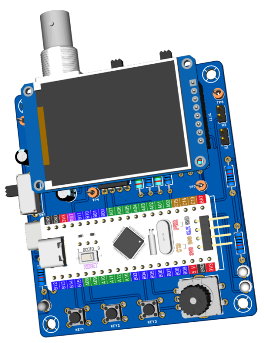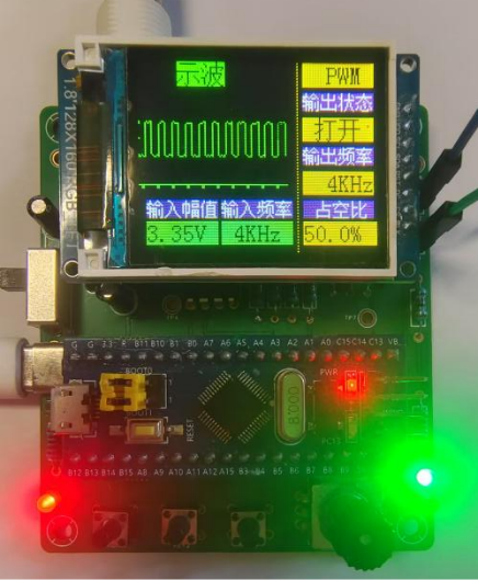 除了示波器检测功能外,单独引出了一个PWM信号用于模拟一个简易的函数发生器功能,可以通过改变输出PWM的频率和占空比输出一个简易方波信与输出。