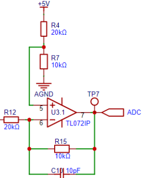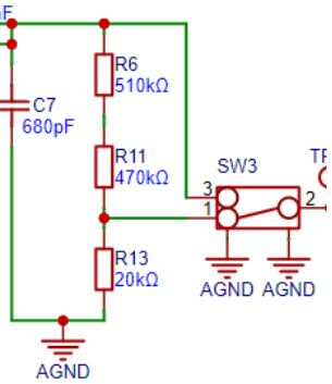 ② 输入信号衰减电路 信号经过交直流耦合选择电路后由开关sW3选择两个通道,开关2和3接到一起时,输入信号直接流入后级的电压跟随器电路:当开关2和1接到一起时,输入信号经过R6、R11、R13三个电阳构成的电阳分压网络后将信号衰减到了1/50倍,由此可知,当输入信号幅值较小时,可优先选择低压档位,如果测量时不确定输入信号幅值可先用高压档位测量后如满足低压范围内,可用低压档位测量以得到更为精准的测量结果,同时保护电路。