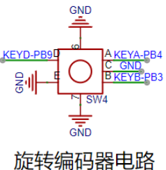 旋转编码器属于一种特殊的按键,系统使用的EC11旋转编码器有五个引脚,其中DE两个引脚类似于普通按键引脚,按下导通,松手断开,其余ABC三个引脚用于检测旋钮的转动方向,c脚为公共端,直接接地就行。在旋转编码器时,A和B两个信号引脚存在相位差,也就是有一个引脚信号变化后另一个引脚信号再跟着变化,即两个引脚不同时变化,通过检测哪个引脚先变就能判断是正转还是反转功能。