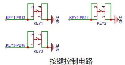 系统使用了三个独立按键对系统进行控制,三个按键一侧直接接地,另一侧连接到单片机引脚,当单片机引脚检测到按键按下时,单片机引脚直接接到GND接地,单片机收到该引脚接地信号的反馈后再去实现对应的功能,为节约硬件成本,可以在软件设计时引入消抖功能,避免机械按键抖动时的误触发。