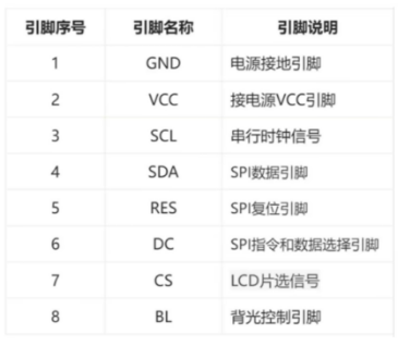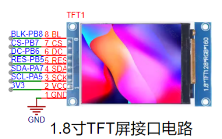 (3) 人机交互电路 1.8TFT 是一款彩色显示屏,具有 128x160 个彩色像素,使用四线SPI通信方式与单片机进行连接,一共有八根引脚,模块引脚说明及与单片机连接情况如上所示: