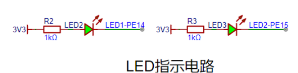LED指示电路设计比较简答,采用低电平驱动的方式,当单片机引脚输出为低电平时,LED两端存在电势差,LED点亮:当单片机引脚输出为高电平时,LED灯熄灭: