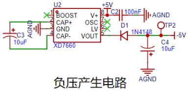 (2) 电源控制电路 除了电源输入电路外,为保障运算放大器对于负电压的测量性能,使用了XD7660负压产生电路得到个负电压,该芯片外围电路简单,只需要两个电容和一个二极管即可工作,理论上输入电压为+5V,也可以输出一个-5V的电压,由于芯片内部存在一定压降及转换效率,实际测量负电压为-4.3V左右,也能满足运算放大器的要求。