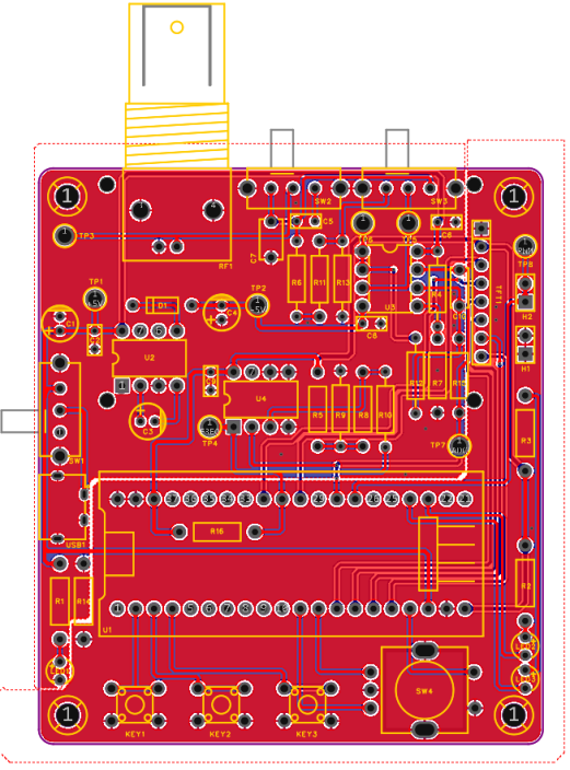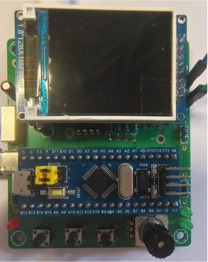 5.系统调试结果分析 采用5V电源通过USB供电,通过调试,各电路和功能模块均正常工作,可实现以下内容: ⑥ 在1.8寸TFT屏幕上显示波形; ⑦ 支持通过旋钮对波形进行放大与缩小查看; ⑧ 支持输出1K、2K、4K方波信号,能够被自身输入检测到并显示在示波器上; ⑨ 支持通过按键调整占空比 ⑩ 支持频率测量 实物如下: