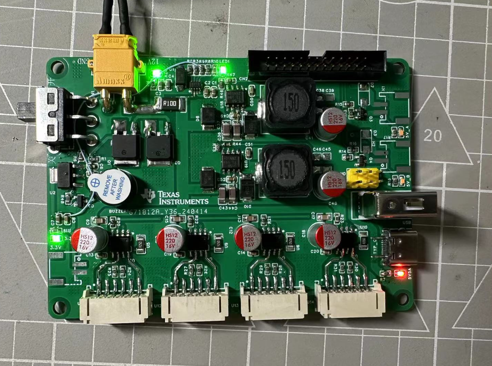 板子也使用了2路TPS5450DDA作为5V5A输出,为上位机树莓派或者鲁班猫等其他模块供电,理论输出最大5A,不过因为没有负载仪还没有测试,不过两路输出电压都很不错,全板上了固态电容。板卡上添加了ina219作为电路检测,相比ADC的方式能获取到更多数据,比如电流、电压、功率。