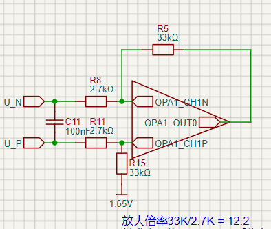 - 基准电压:由于采集的电机电流是正弦波,因此需要采集方向相反幅值相同的值;ADC无法做到;在采用1.65V偏置的差分放大电路后,即可将待采样的交流电压映射到0~3.3V的正电压区间。