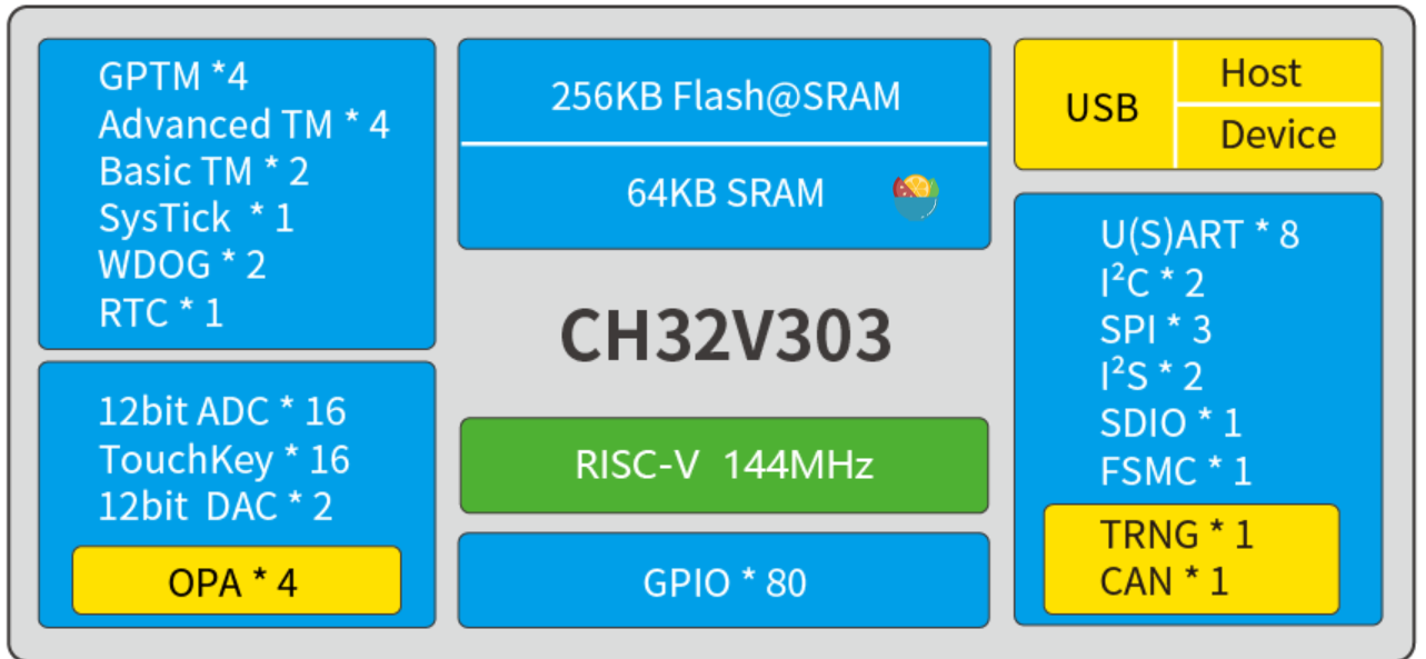 CH32V30x系列是WCH(沁恒微电子)推出的基于32位RISC-V设计的工业级通用微控制器,配备了硬件堆栈区、快速中断入口,在标准RISC-V基础上大大提高了中断响应速度。CH32V303系列搭载V4F内核。加入单精度浮点指令集,扩充堆栈区,具有更高的运算性能,扩展串口UART数量到8组,电机定时器到4组。