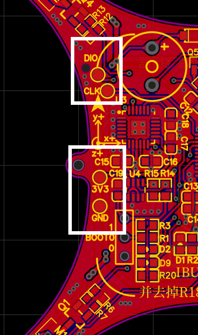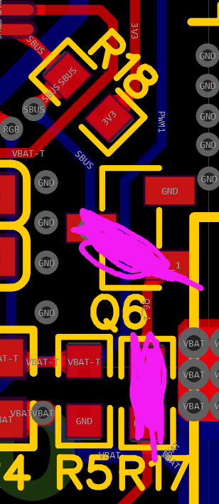 已更新功能1:将TX2引出,原先只引出了RX2(用于连接SBUS或者IBUS这种单线协议),但是ELRS等需要使用RX与TX的接收机也很多,因此我将TX2也引出来了,但是全部焊接元 件的话RX2还是SBUS模式,因为有个S8050反相器,不需要SBUS则不用焊接R18 R17 Q6,只需短接R17与Q6划线处即可,R18空着就行。紫色划线处焊盘就是使用非SBUS接受机所需用锡短接的地方
