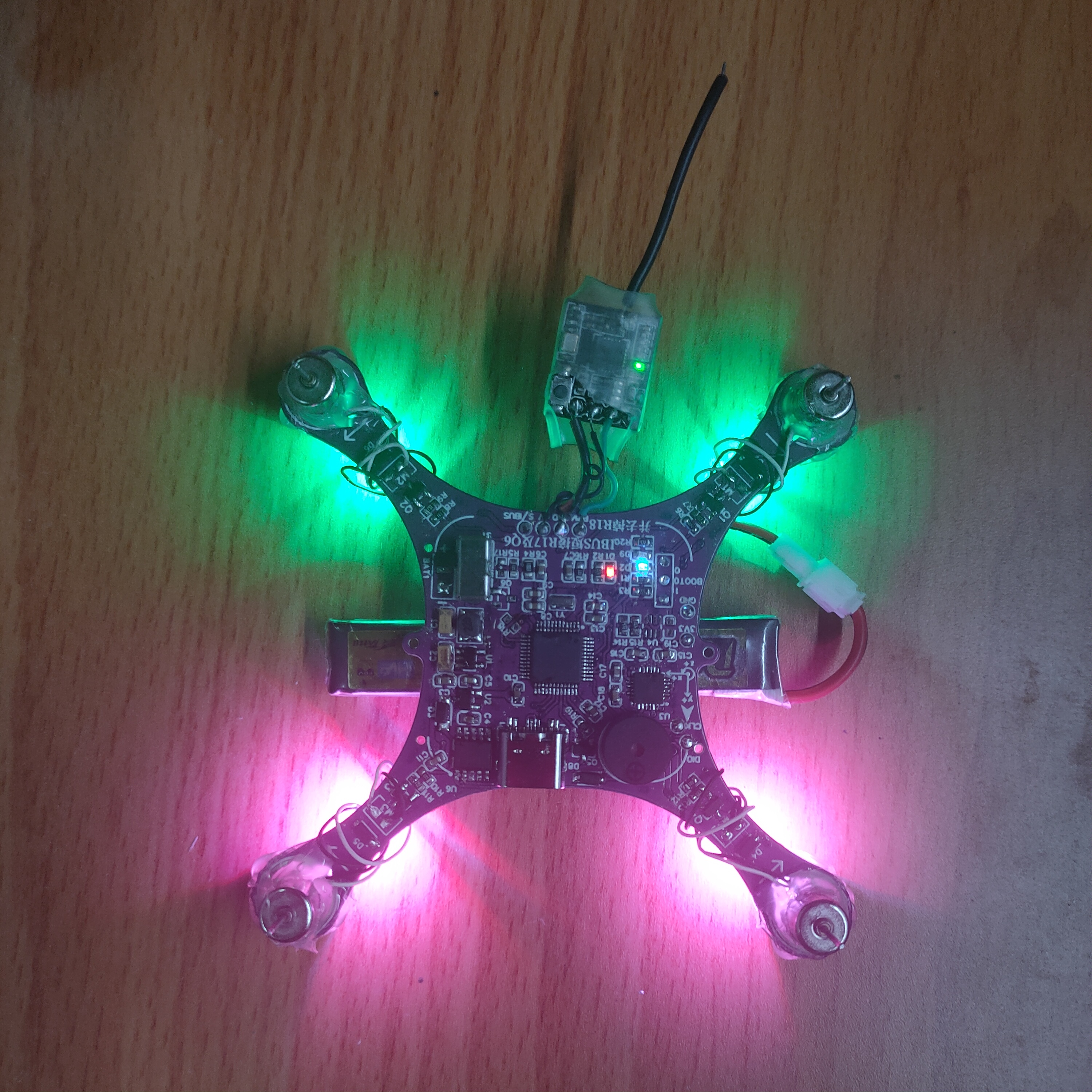 灯光说明: 粉色灯珠方向为机头,未解锁时显示粉色,电机解锁时显示蓝色.