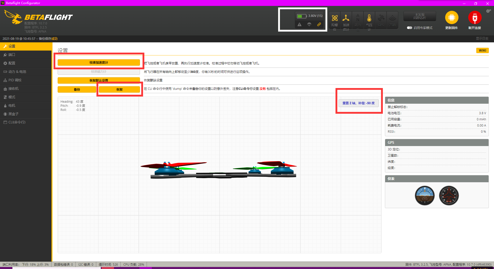 等待左上角提示恢复成功后将飞机放平,点击重置Z轴,再点击校准加速度计即可。