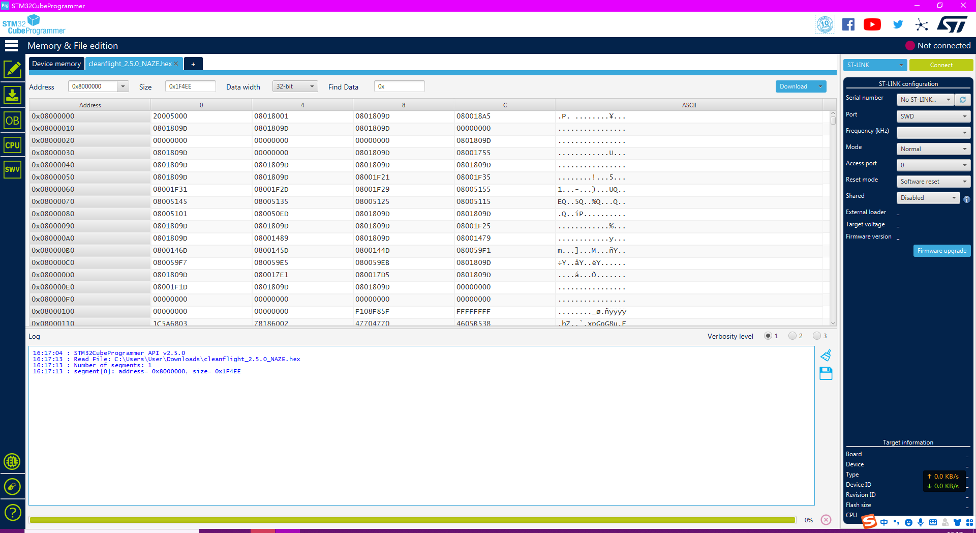 固件烧录:我是用的STLINK。如果是串口下载需要将BOOT0短接至1,然后使用杜邦线短接一下C7旁边的RST焊盘与GND焊盘。附件我上传了CF和BF的NAZE32固件,最迷的是刷的BF固件能用CF来调参,建议使用BF版本的固件,使用BF调参。烧录固件可以用STM32CUBEprogrammer,没有STLINK但是有JLINK,DAPLINK的话可以用KEIL5直接烧录HEX文件(具体百度,在此不做说明)。