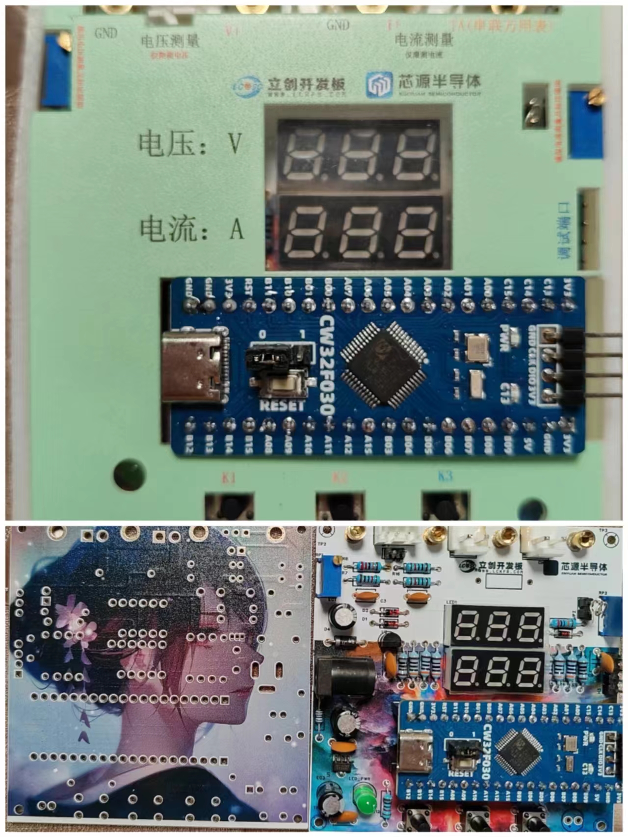 本项目基于立创地文星开发板,其采用芯源半导体cw32f030c8t6,该芯片具有优秀的ADC性能。使本表可以同时测量0-30V电压以及0-3A电流,有不错的实用价值。