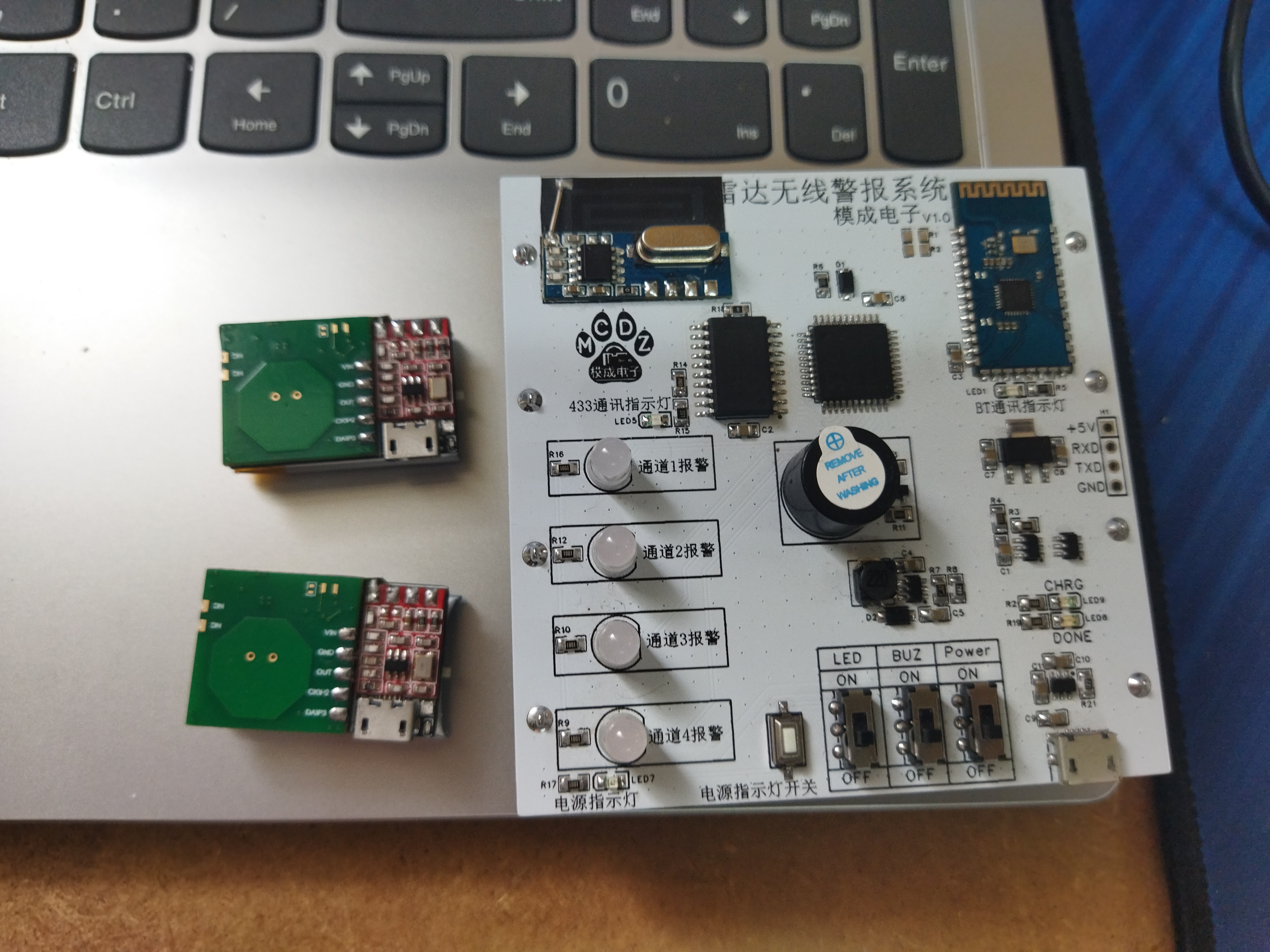 接收器433硬件解码发送到单片机,单片机处理报警信息声光显示和通过蓝牙发数据包到上位机设备。