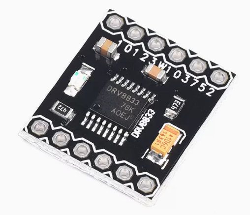 马达驱动模块使用黑色DRV8833模块(3元左右),占用4路PWM引脚和4路数字引脚。使用马达时相应的控制引脚不能再做他用,不用马达时可以接传感器或其他器件。