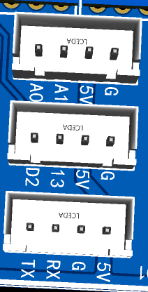 引出所有UNO引脚,使用排针作为接口每组包含一个引脚和vcc,gnd,顺序兼容舵机引脚(GVS),