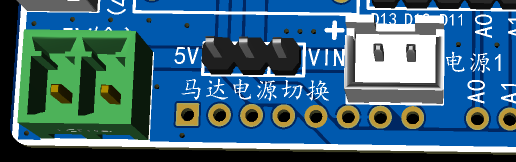 电源可以使用UNO的DC接口供电或者焊接端子,此电源建议不超过10V,国产UNO板板载稳压芯片质量不稳定+drv8833模块耐压10.8V。若控制多个电机或者做小车或者控制多个舵机或者使用大电流舵机比如995,996舵机需要外接5V供电也可以焊接5V供电的端子进行供电。电机供电使用跳线帽在5V和VIN之间进行选择。