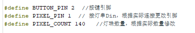 本例需要提前安装NeoPixel库,在代码中修改灯珠数量和Din、按键所连接的I/O口。按键另一端接地。