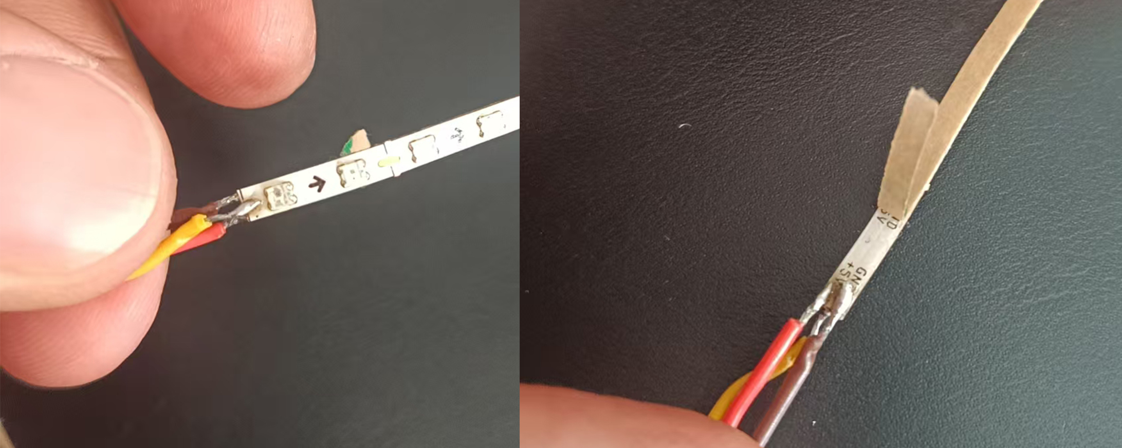 4.固定好灯带后,在起点处使用三根细线焊接灯带的5v、gnd、din三根线,5v和gnd在背面,din在正面。注意箭头方向。