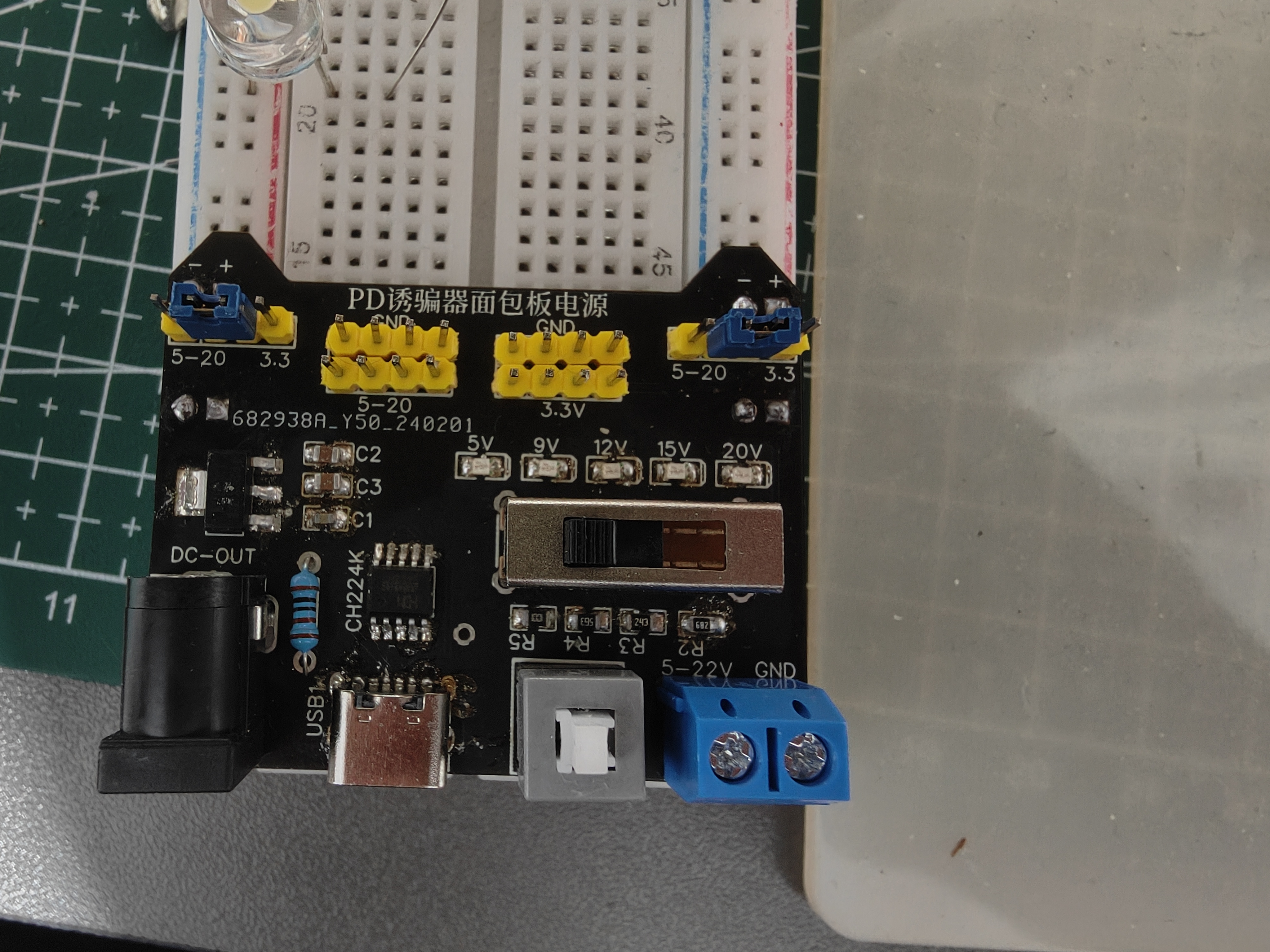 本项目基于CH224K芯片,诱骗PD电源,为你的面包板项目提供3.3V 5V 9V 12V 20V 20-60w的电源输出(具体功率取决于你使用的PD电源)。