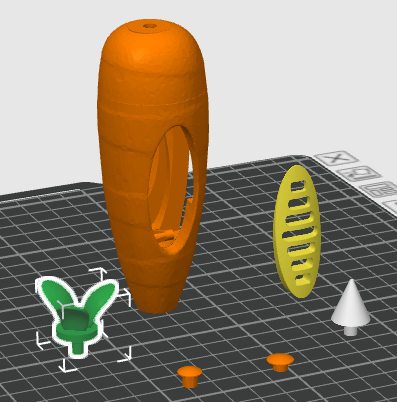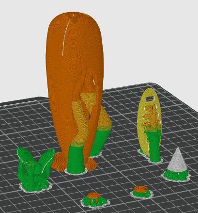 如图放置在3D打印切片界面,分开打印,不用多色,多色有点慢,自动添加支撑(如图放置层纹比较自然)