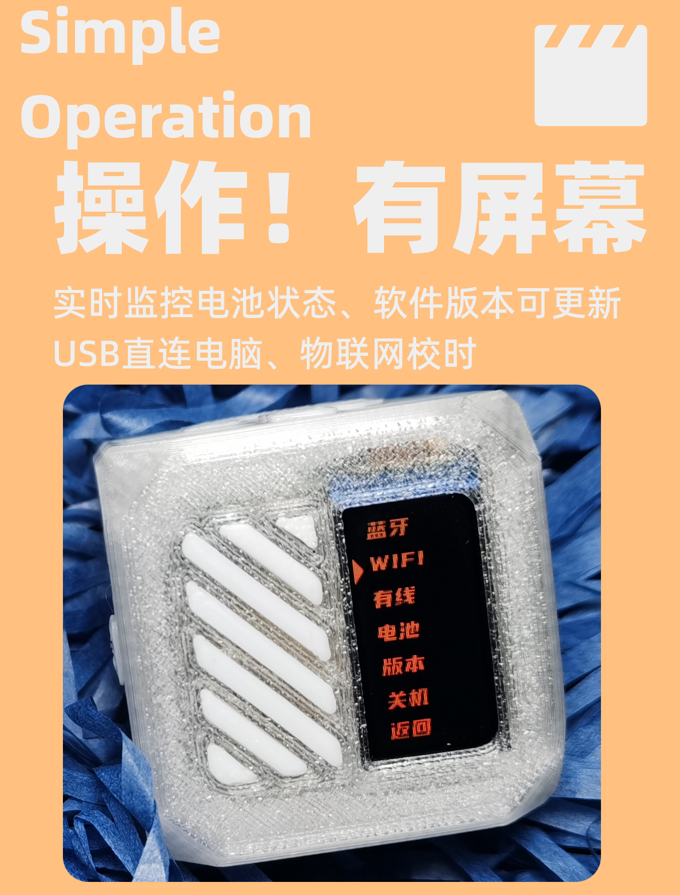 2)触摸按钮:1.返回:屏幕朝上,触摸1秒返回上一页菜单。2:关机:长触3秒关机。