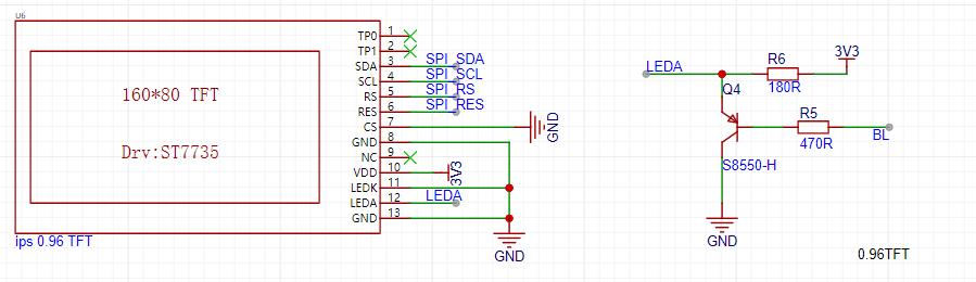 0.96寸TFT彩色屏幕,淘宝比较热门的st7735方案,软件SPI驱动,没有采用硬件SPI驱动;驱动速度稍微比较慢,UI设计时,硬件避免大面积刷新UI。
