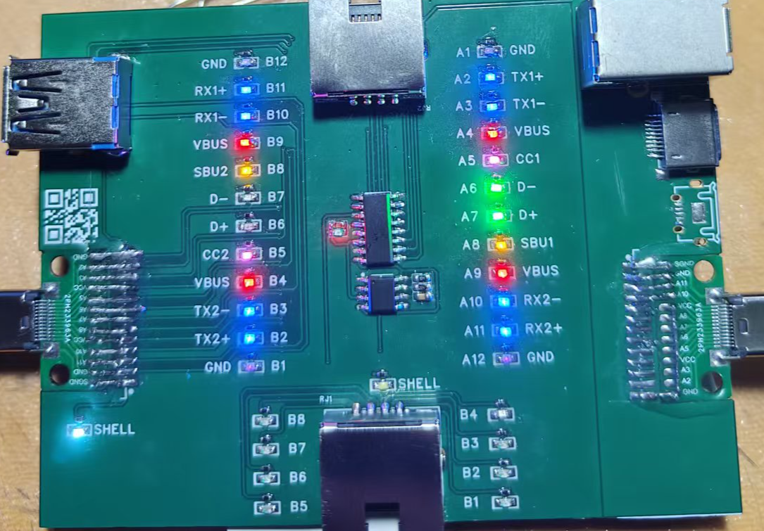 使用现成的typec母口模块,大大降低焊接难度,添加了流水灯式的网线线序检测,正常网线应该从一到八依次点亮。