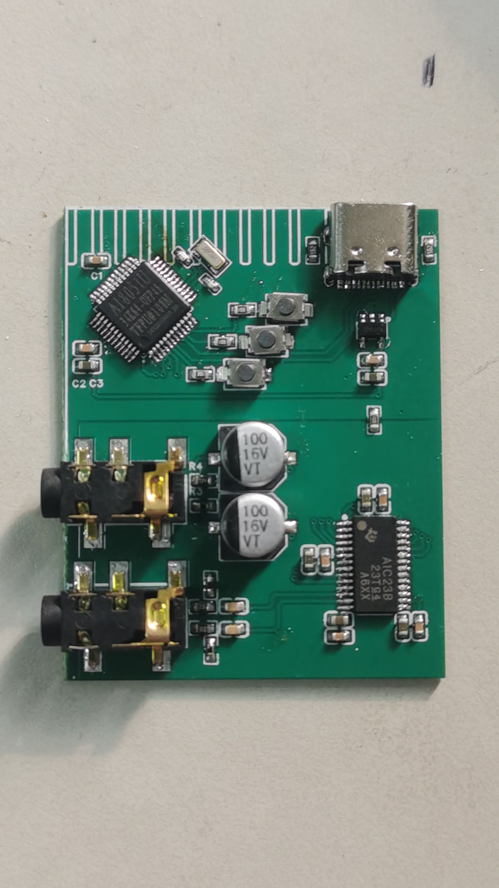 用AI8051搓出来了一块音频开发板,烧录时注意按一下中间的按键。焊接时耳机座子多加焊锡,不然座子容易顶下来