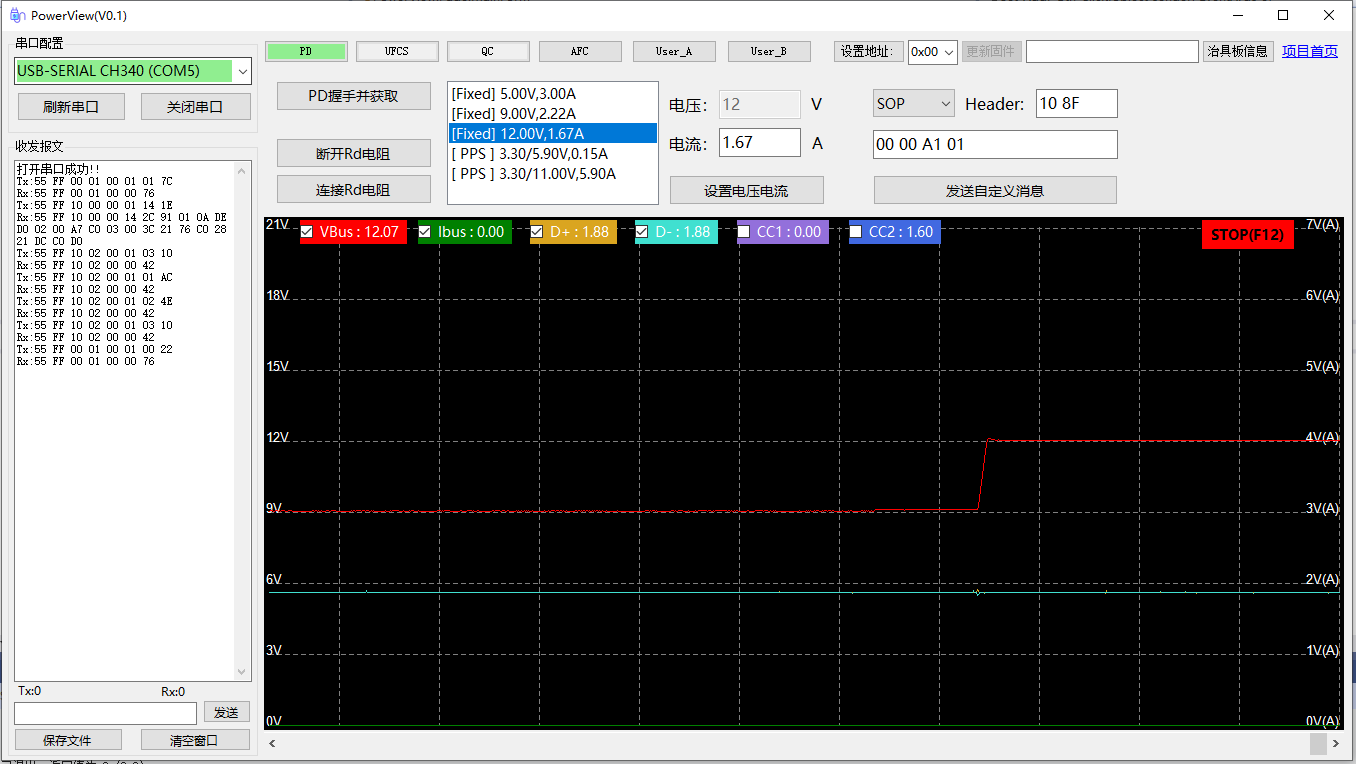 在PD协议下,点击握手将会断开Rd电阻,然后再连接,接收Source发来的Cap,回应GoodCRC,并请求5V。双击对应的档位可进行调压。也可以发送任何自定义PD消息。