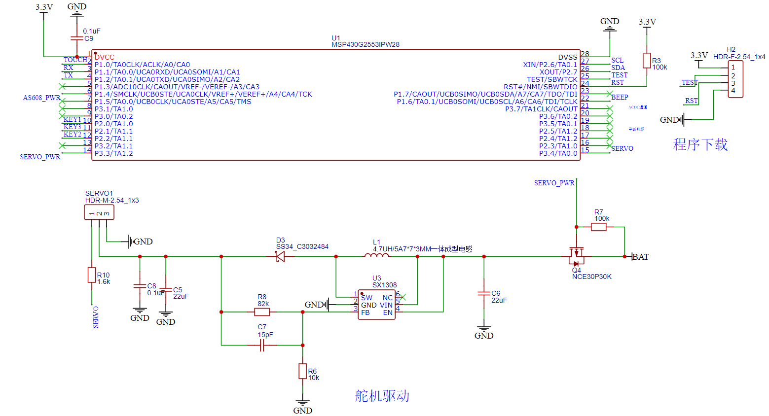 1.主控采用MSP430G2553实现超低功耗控制,当指纹识别成功后用sx1308升压芯片将18650电池的电压升至5V驱动舵机开门
