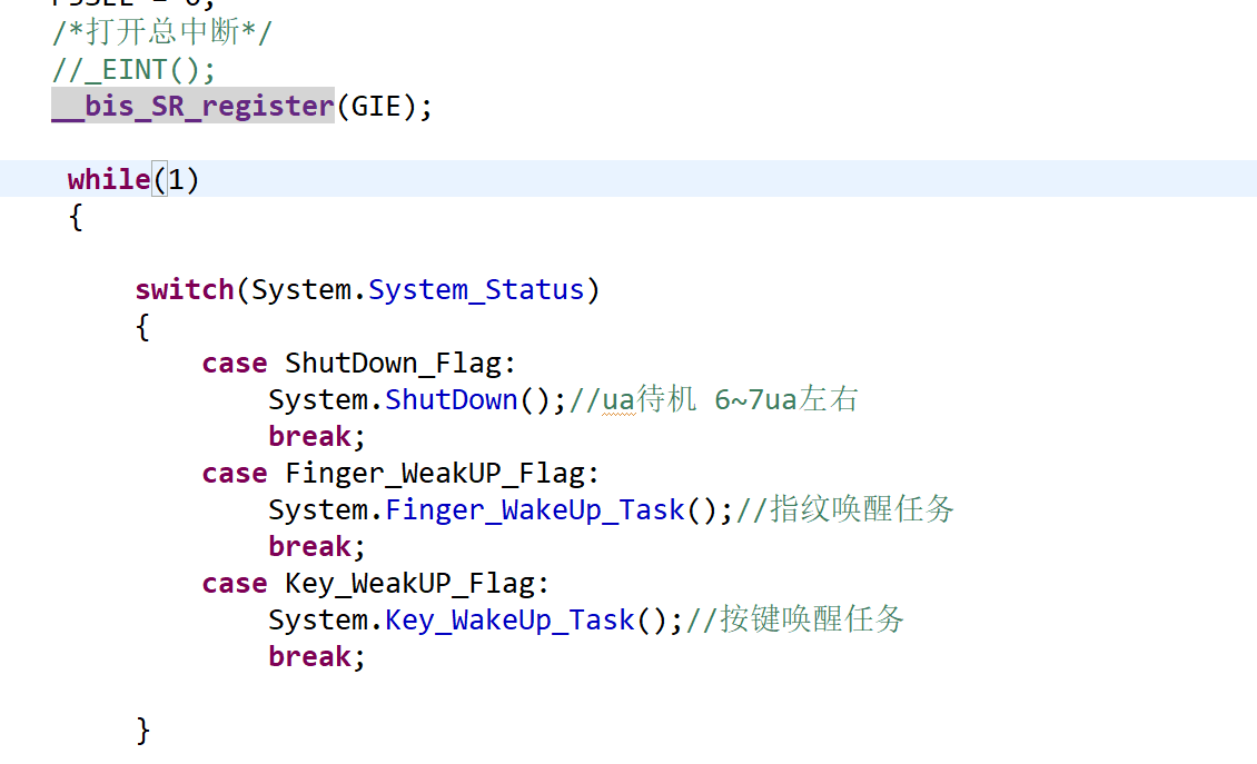 主函数采用面向对象编程思维设计了三大程序任务:休眠、指纹识别、按键功能选择