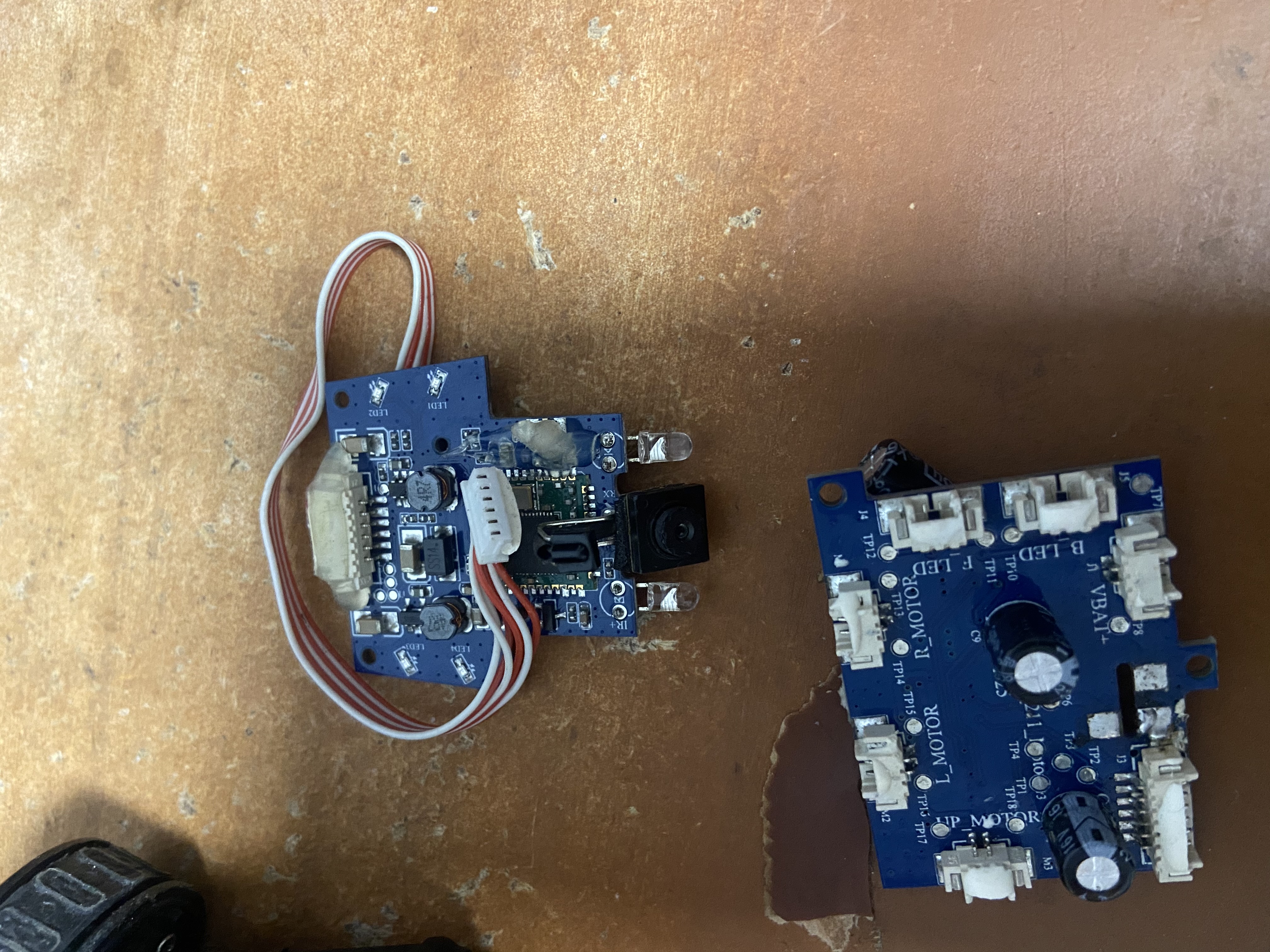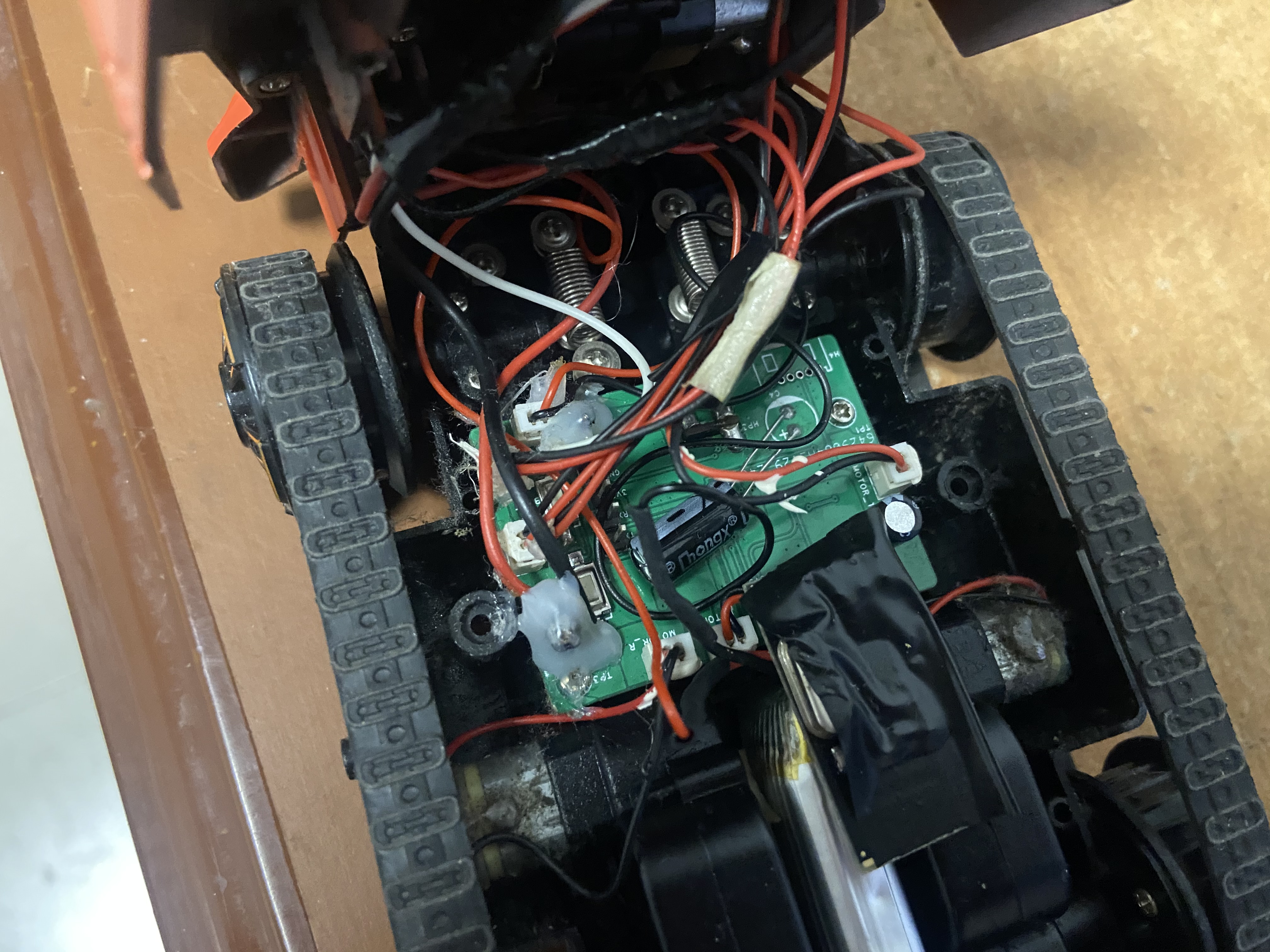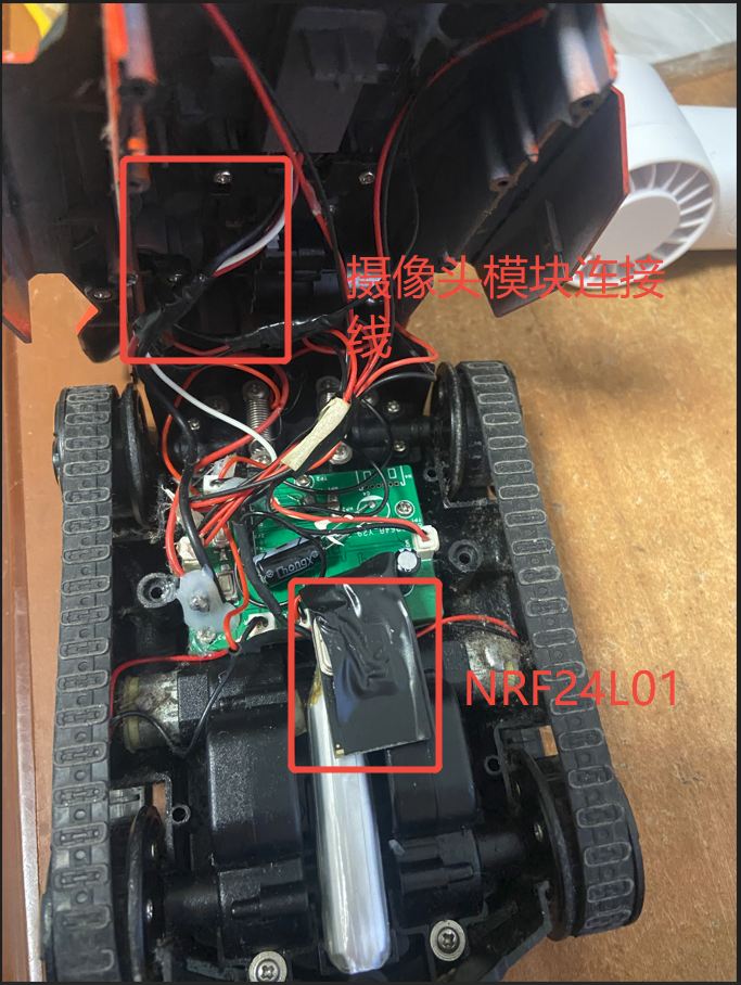 这是里面原来的驱动板和wifi模块,可以看到原来板子做工也可以,上面还有个红外传感器,应该是用来完成坦克对战的。之前还想着将原有的WIFI模块留下来使用,因此设计的PCB上还预留了相同的接口。但是操作过程中发现技术有限,无法明确这几根线的具体用途和数据,因而放弃这个思路。