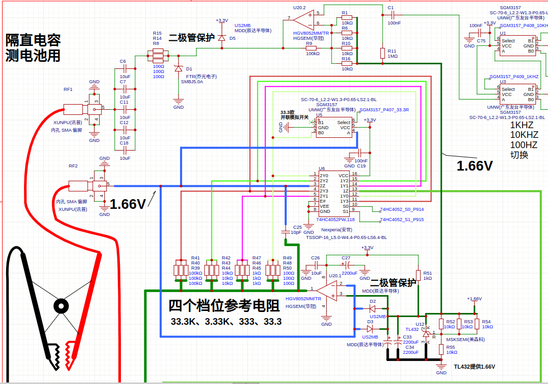 RC滤波后C1隔直后抬高1.66V进入U20.2运放放大,这里采用高倍放大,放大倍数低了会引起高频振荡。运放输出经过33.3欧电阻和50UF电容到RF1输出,D1 D5保护。 RF1、RF2接开尔文夹走电流,U20.1反相放大,74HC4052切换放大倍数,分辨有4个档位,33.3欧、333欧、3.33千欧、33.3千欧,最低档位由于74HC4052导通电阻大于是并联了3157模拟开关用来降低电阻,TL432提供1.66V参考地电压,和D2、D3、C33、C34组成输入保护电路,四个量程电阻也采用四线测量法,正好74HC4052有两组开关,这个部分是参考开源电桥电路。