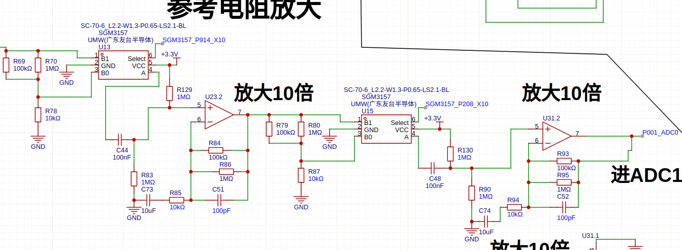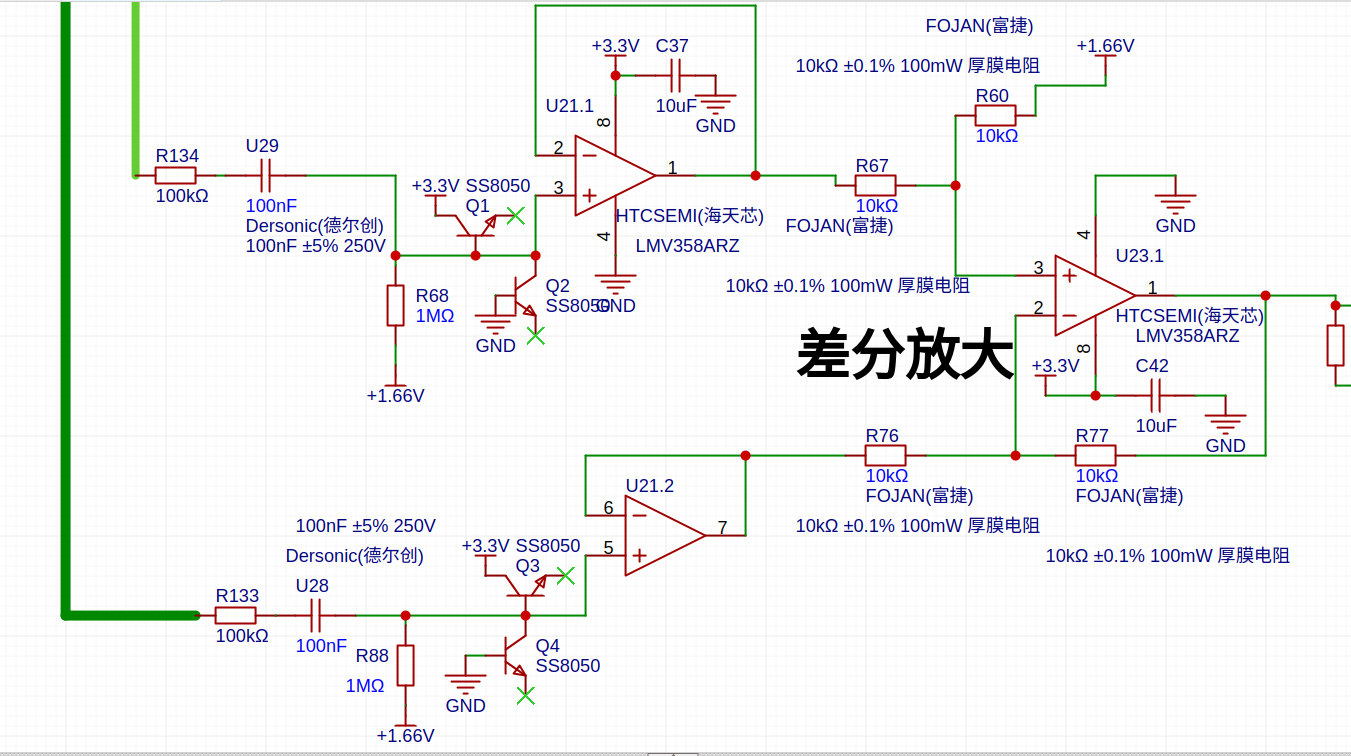 参考电阻上或者被测电阻上电压经过100K电阻和100NF电容隔直后,通过1M电阻抬高1.66v,SS8050代替二极管保护防止烧运放,进入运算放大器跟随输出,U23.1差分放大。