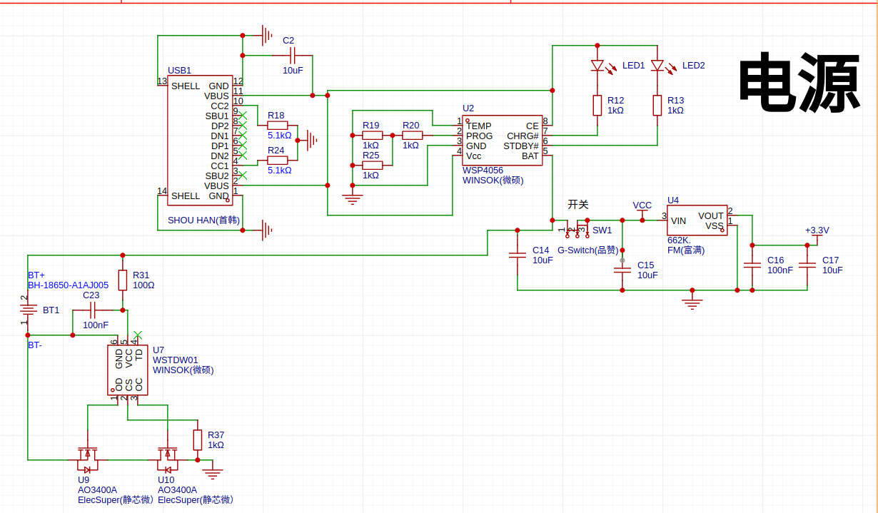 电源部分采用18650供电,DW01保护,4056充电,SW1为整机电源开关,U4转3.3V,夹子短路时最大功耗不超40毫安。
