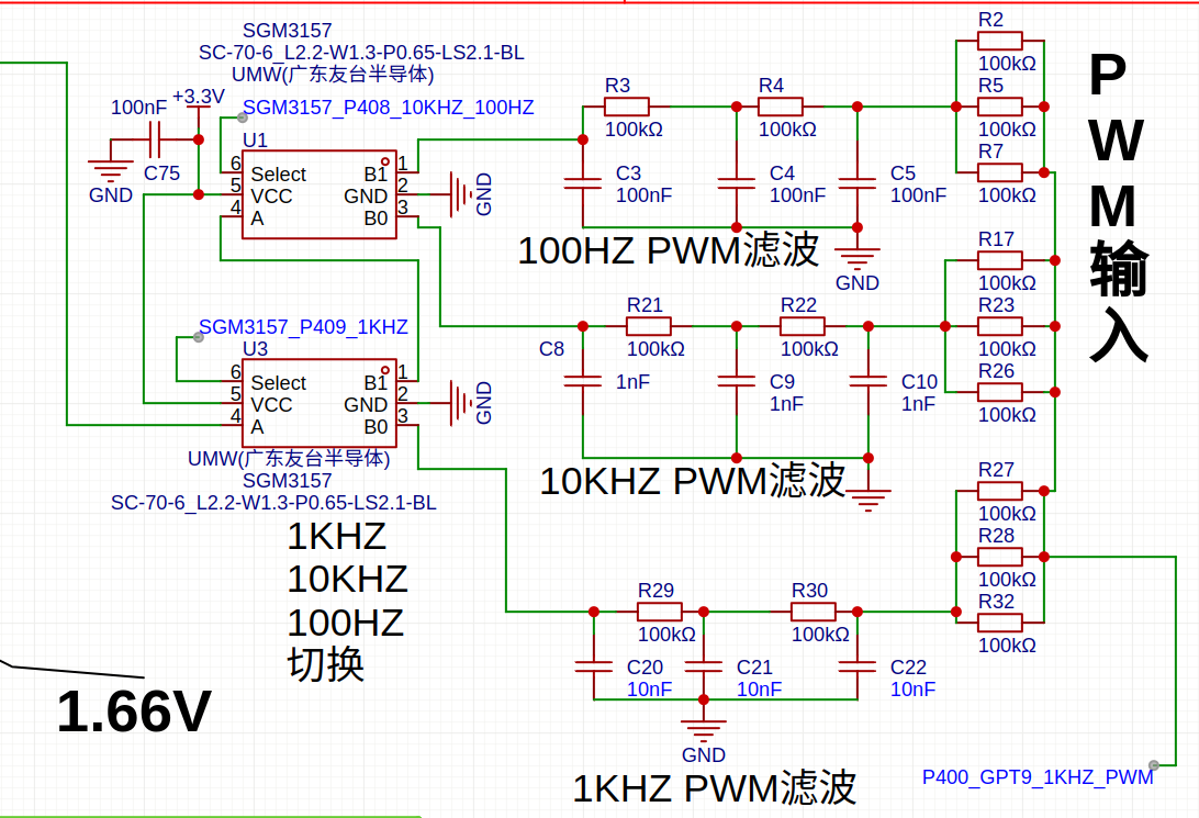PWM滤波电路直接采用RC滤波,RC滤波后为正弦波,降低单片机程序编写难度,两个3157模拟开关切换三路RC滤波器作为激励源,为了减少RC滤波电路元器件衰减的比较大,由于衰减比较大造成信号比较小容易被干扰,而且后级需要高倍放大造成温飘比较大,但是 因为两路采集,实际这里温飘对最后读数影响不大。
