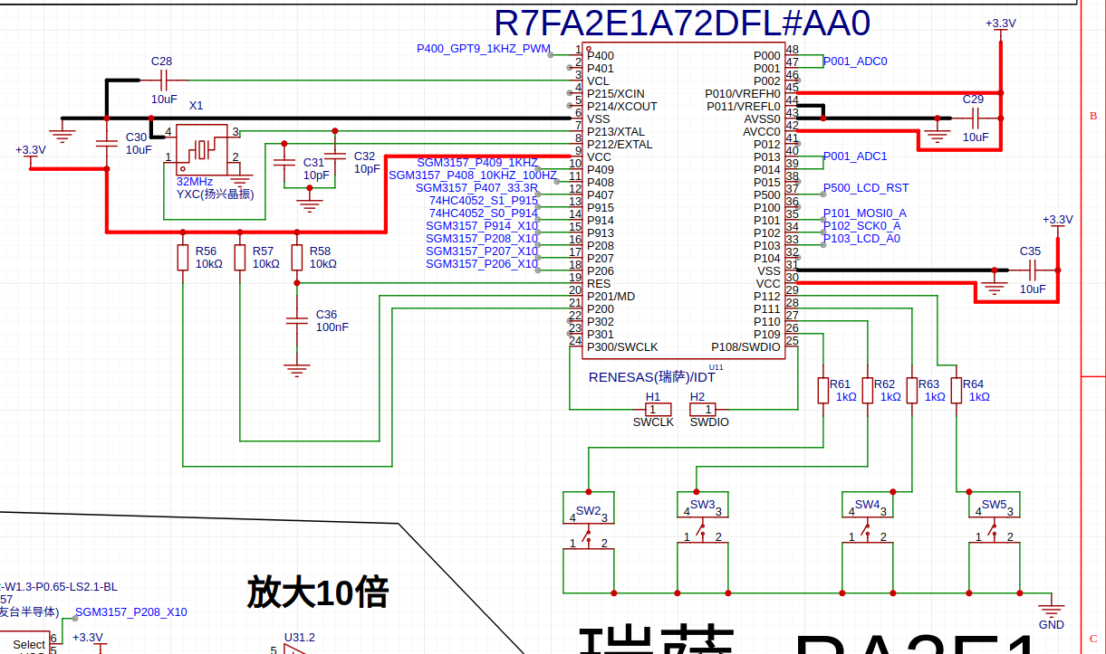 采用瑞萨R7FA2E1A7单片机作为主控,32MHZ晶振,手册最高为20MHZ,但是想验证自己想法采样4个ADC口采集,采样率50KHZ,采集到的数据都要进行DFT运算,计算量比较大,计算DFT频率是70K左右,刚好能出中断,于是超了下频。引脚功能:P400输出PWM,P409、P408通过模拟开关切换PWM滤波电路作为激励源。 P407档位切换33.3欧模拟开关,因为74HC4052模拟开关导通电阻比较大,无法满足最低档位要求,所以在33.3欧档位并联了一片3157模拟开关降低导通电阻。P915、P914是档位切换74HC4052的控制端口,用来切换不同档位的电阻,P206 P207被测元器件放大倍数开关,每个放大10倍,P208、P914是内部V/I电路采样电阻放大开关,每个也是放大10倍。 P300和P108是SWD口,JLINK V9需要连接4根线,3.3、GND、SWDIO、SWCLK。 P000、P001是V/I路电阻采样口,P013、P014是被测元器件采样口,采用双口采集验证下自己提高分辨率的想法。ADC直接用AVCC和AVSS作为参考,而且直接和单片机数字电源想连,这样可能会增加ADC读数跳动。 P500、P101、P102、P103是LCD液晶驱动口。P109、P110、P111、P112是四个按键。