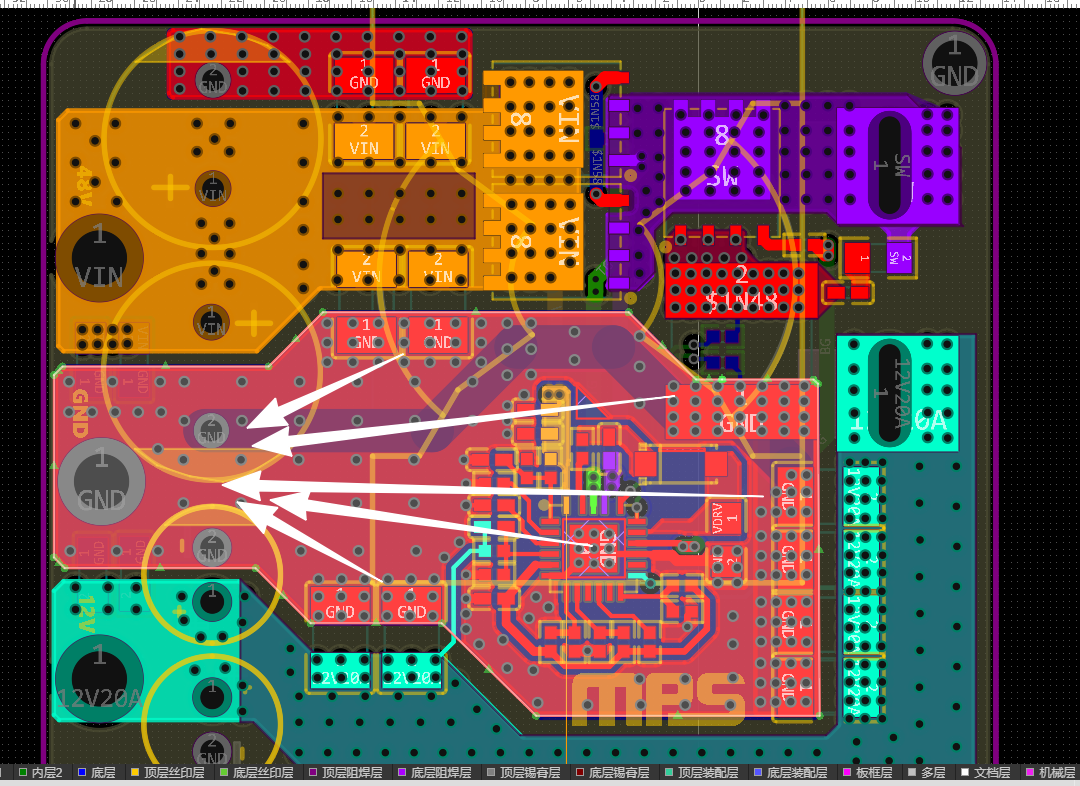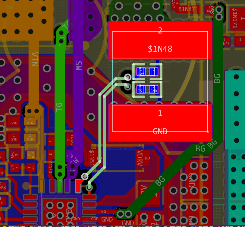 DCDC降压包含开通电流环路(绿色)和管断电流环路(红色),布局一定要短、宽尽量减小环路面积,并且多大过孔提升过流能力,优先考虑地回路的畅通,要是地回路太远或者受阻,那大电流的时候基本就废了,其他设计做的再好都没用。