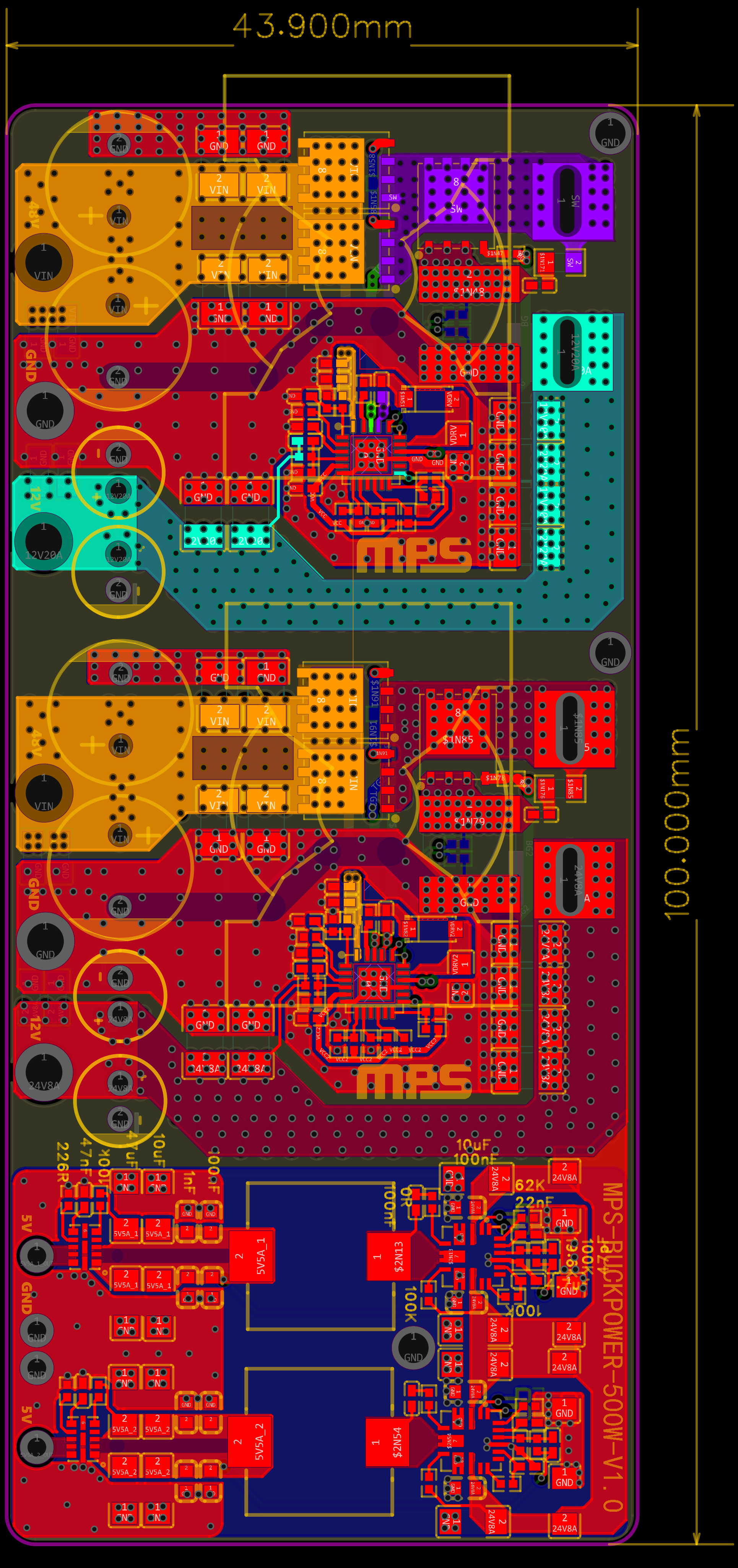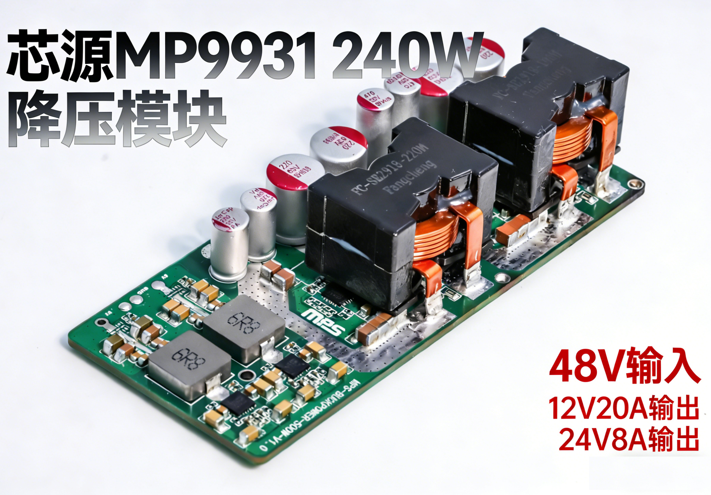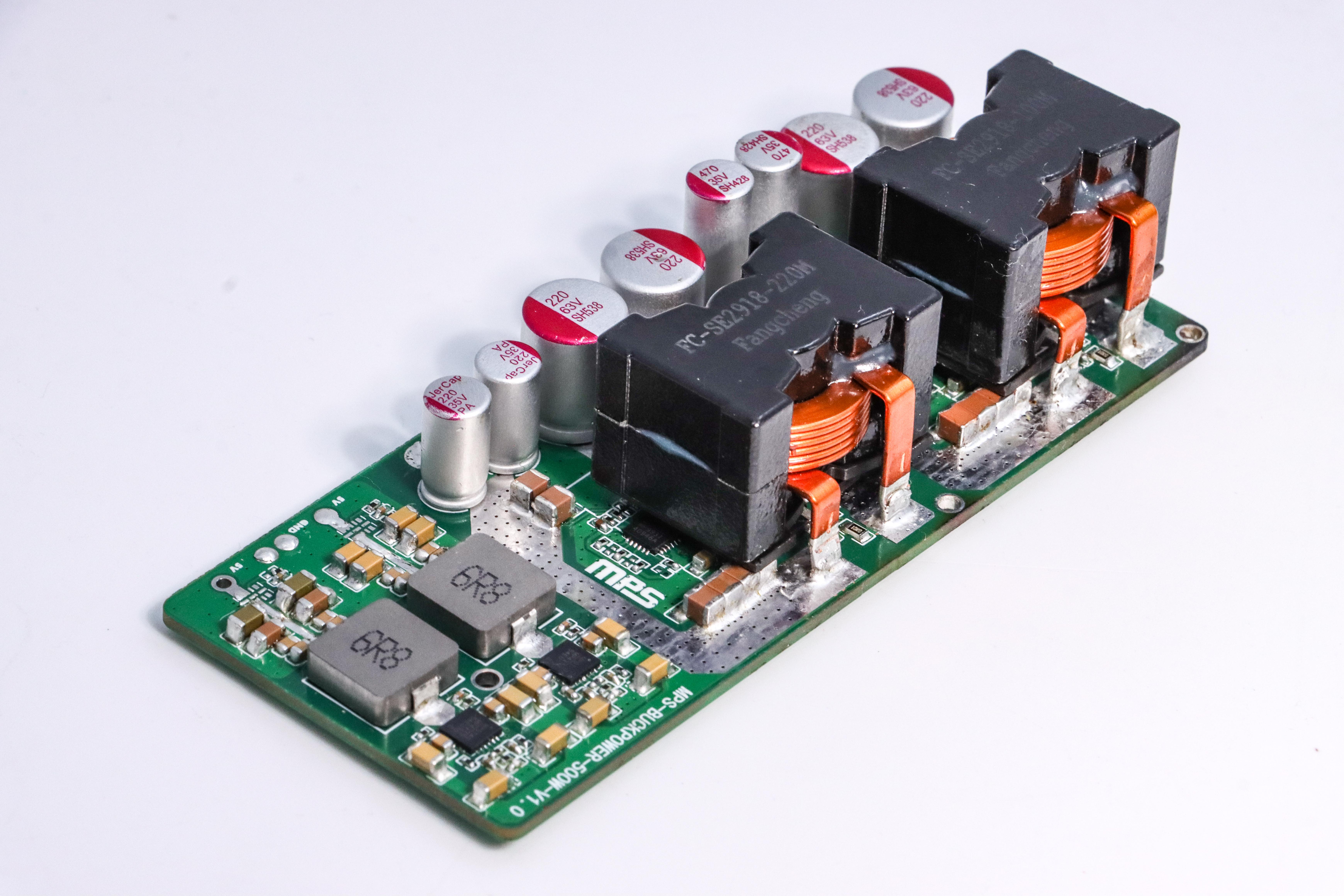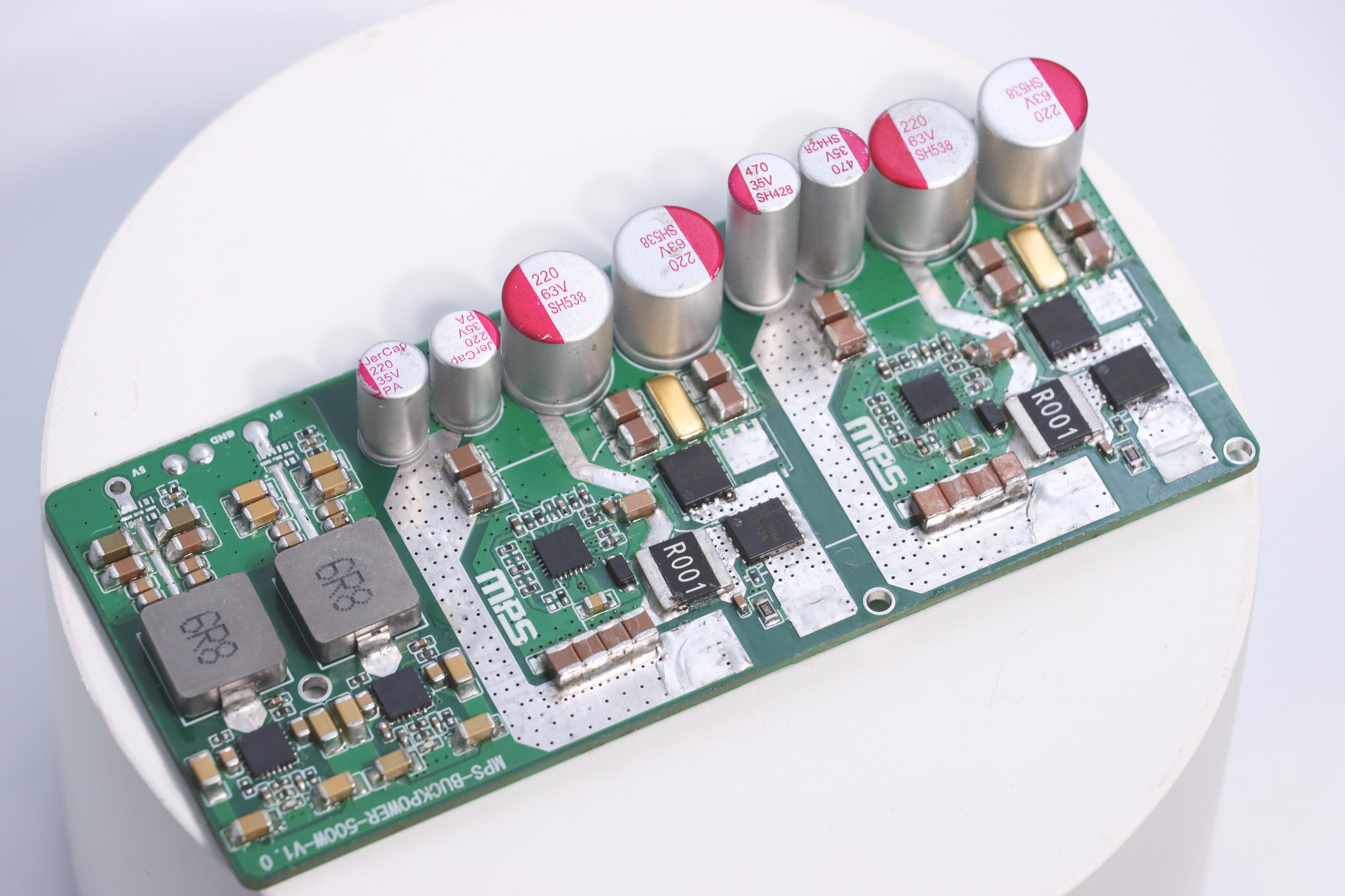 基于MP9931与MP4317GRE-Z芯片的总功率500W电源,48V输入12V/20A、24V8A、5V5A输出,使用可焊接引脚,能直接焊接在主板上使用