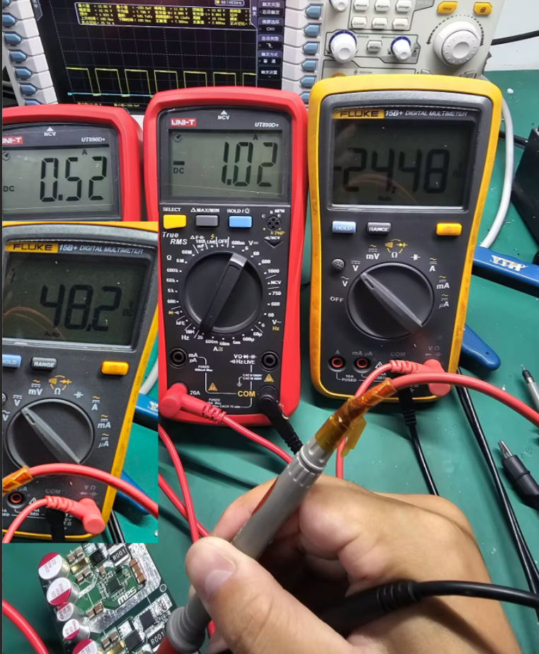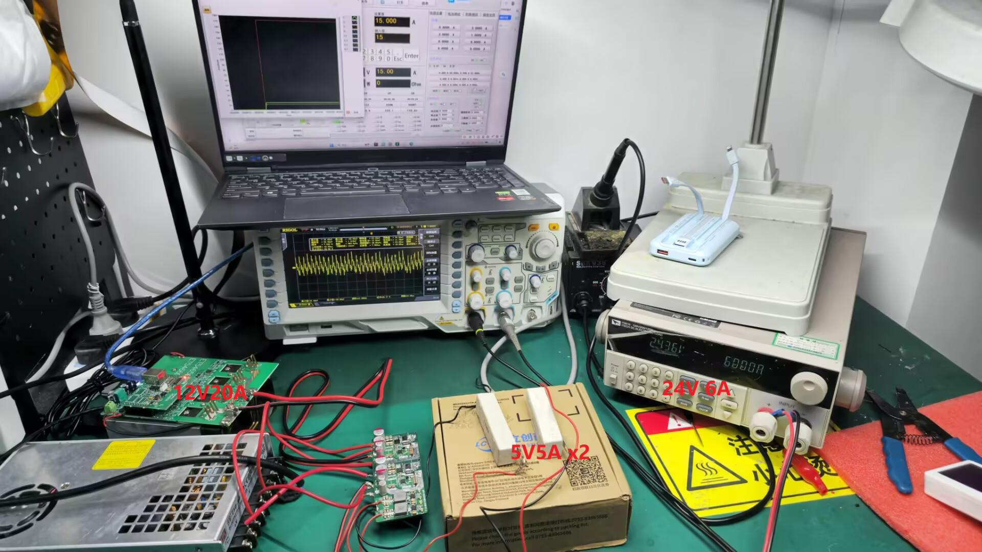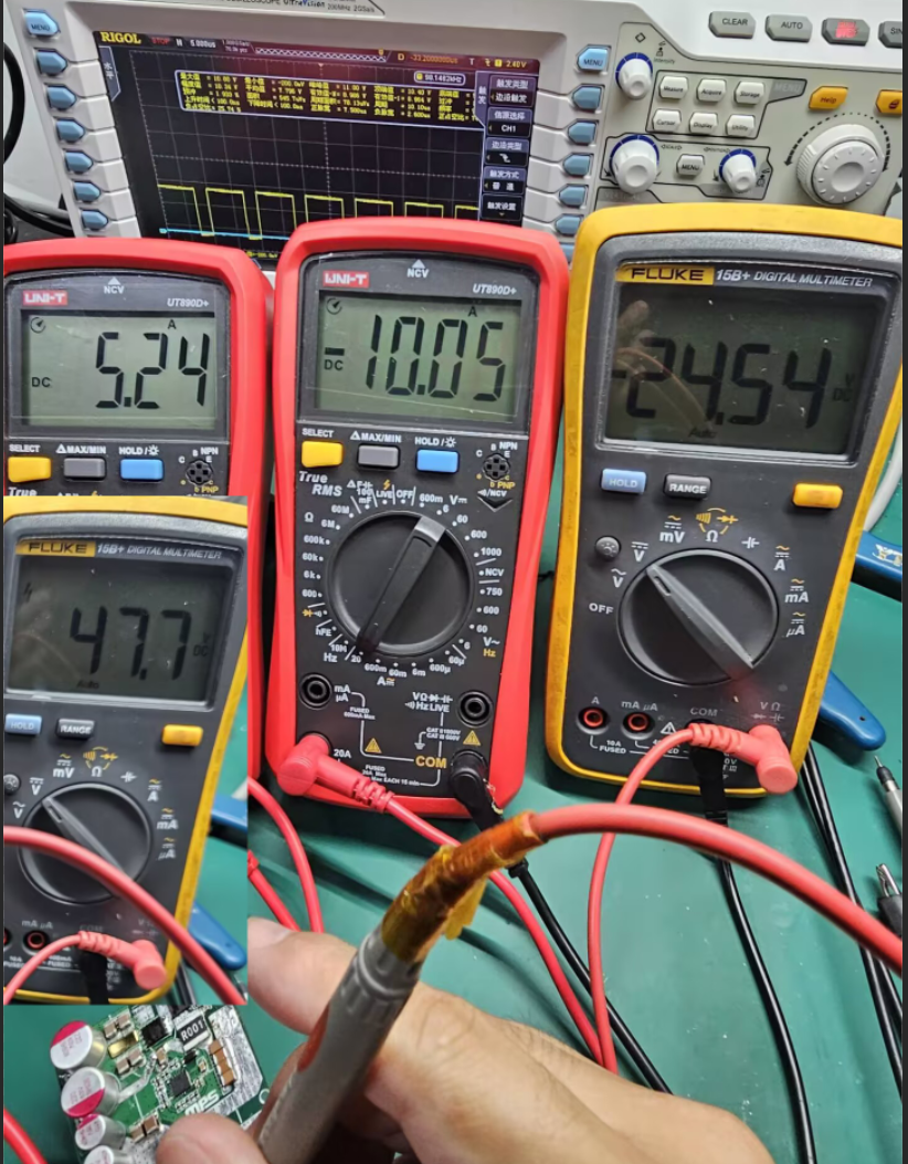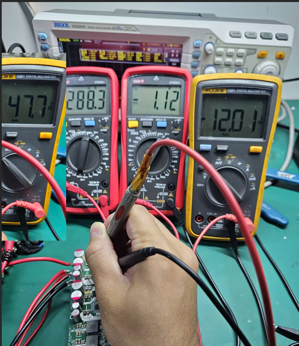 测试要求:通道①: MP9931带载12V15A模拟工控机;通道②: 24V5A + 5V6A×2,即灵巧手端按24V5A模拟,两颗MP5017A后级各带5V5A模拟外设端负载