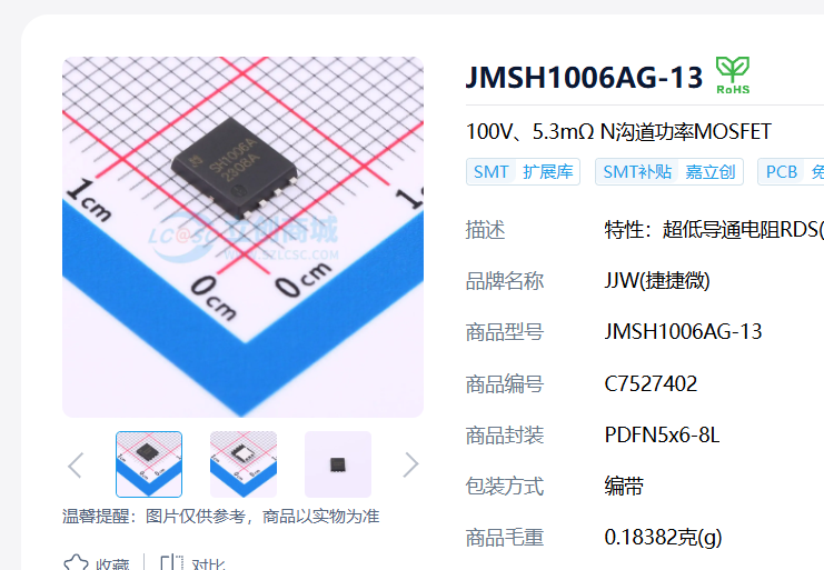 本设计使用的MOS管JMSH1006AG-13(C7527402),其实从参数上满足本设计绰绰有余,主要看PCB功率环路做的好不好。